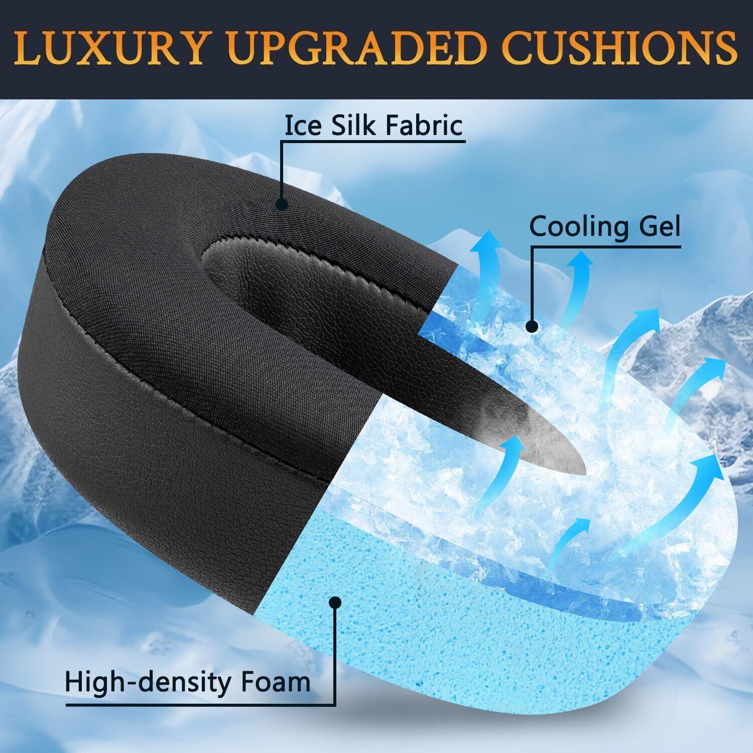 【冷却ジェル】ヘッドパッドの表面は通気性良いのアイスシルク生地を採用されて、その下の層に冷却ジェルが入ります。汗を吸収する素材なので、長時間の間に使用しても蒸れにくいです。ヘッドセットと 超ぴったりです。