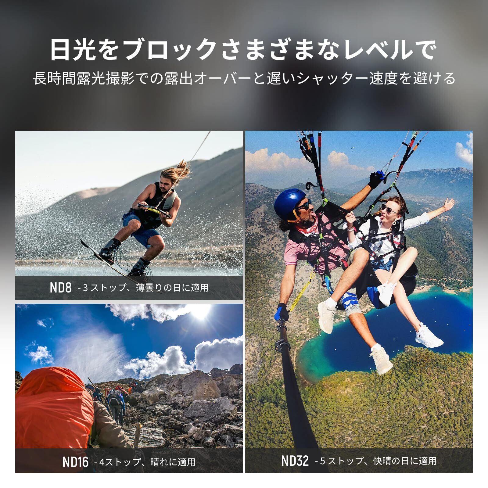 【異なるレベルで日差しを遮る】減光フィルターは、カメラセンサーに入るフィルターの量を減らして、露出オーバーや長時間露光ショットのシャッタースピードの低下を防ぎます。ND8は露光量を3ストップ、ND16は4 ストップ、ND32 は5ストップ減らします。1 つを選択して、さまざまな照明条件下で画像全体のバランスの取れた露出を得るようにします。