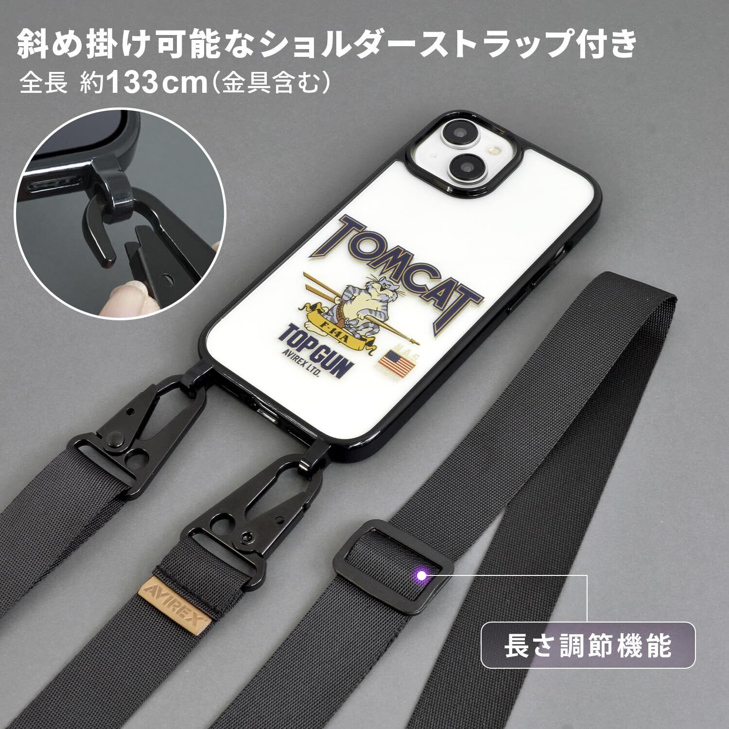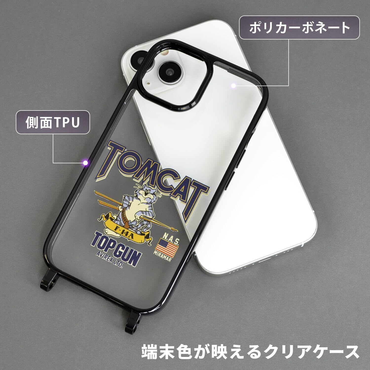 【 AVIREX 正規品 】iPhone15 対応 ケース ショルダー iPhone14/13 「ロングストラップ付きクリアケース」 アヴィレックス 透明 TPU ネックストラップ 肩掛け 首かけ 6.1インチ アイフォン15用 iPhone 15用 ブランド スマホケース (トムキャット)