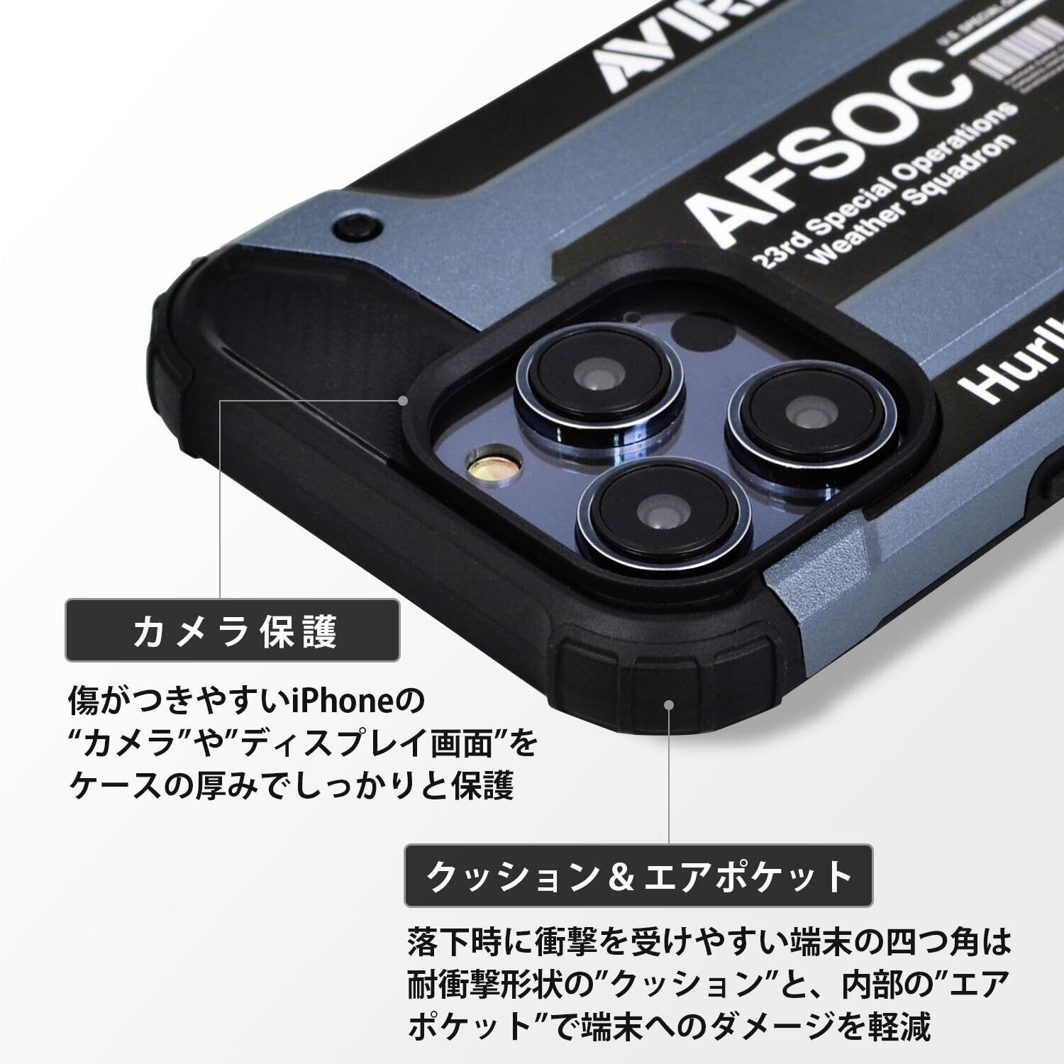 【MIL規格に準じた耐衝撃性能】アメリカの軍事規格であるMIL規格に準じた設計。iPhone端末の傷が付きやすいポイントである、カメラとディスプレイも、ケースの厚みを調整してしっかりと保護しております。