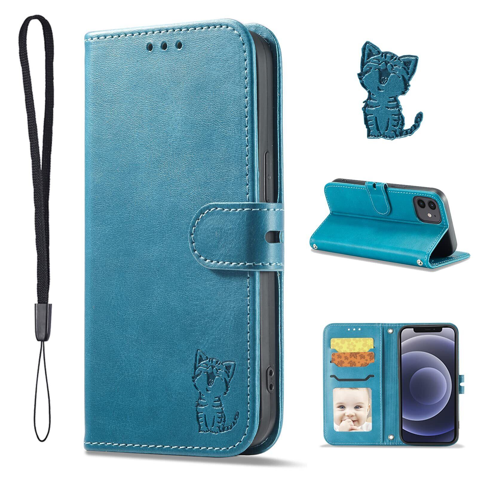 iPhone 15 Plusケース iPhone15 Plus手帳型 iphone15plusケース スマホケース アイフォン 15プラス携帯ケース あいふぉん15カバー case 笑顔猫ちゃん ストラップ付き カード収納 ベルトマグネット スタンド機能 かわいい (iPhone 15Plus 6.7inch対応)ターコイズ