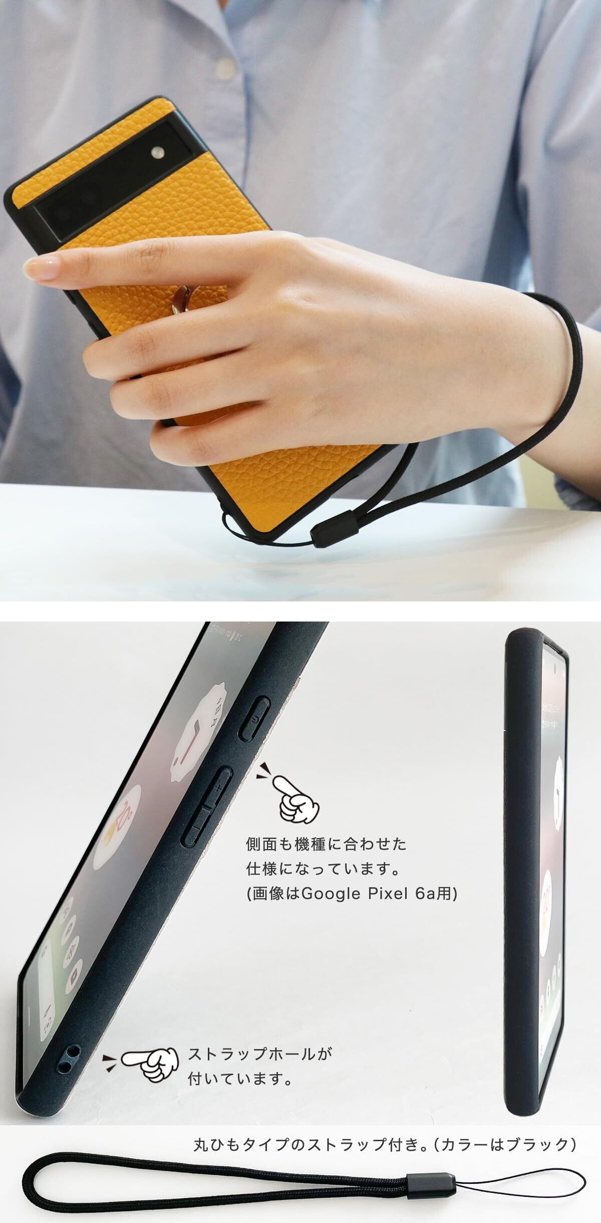 【仕様】ケース本体は耐候性や耐熱性に優れたポリカーボネートを採用し、高品質の素材でスマートフォン本体をしっかり保護しています。側面は柔軟性が高く傷に強いTPUを使用。ボタンを覆うフルカバーの仕様になっており、下部にストラップホールが付いています。※丸ひもタイプのストラップ付属(カラーはブラック) 背面はシュリンクレザーを丁寧に貼り込み仕上げています。シュリンク加工によってできる自然のシボは同じものは2つとなく、型押しでは表現できない独特の味わいがあり、個性をお愉しみいただけます。カーフのやわらかな質感に加え耐久性と弾力性にも優れているのが特徴です。