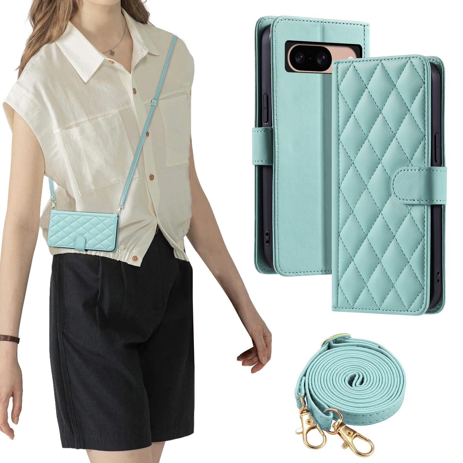laddutoi FOR pixel8 ケース google pixel 8 ケース 手帳型 おしゃれ ストラップ付き スタンド機能 カード収納 軽量 薄型 耐衝撃 高級PUレザー 滑り防止 財布型 内蔵マグネット 開閉式 チェック柄 上質 耐摩擦 マグネット式 肩掛け 斜め掛けーミントグリーン