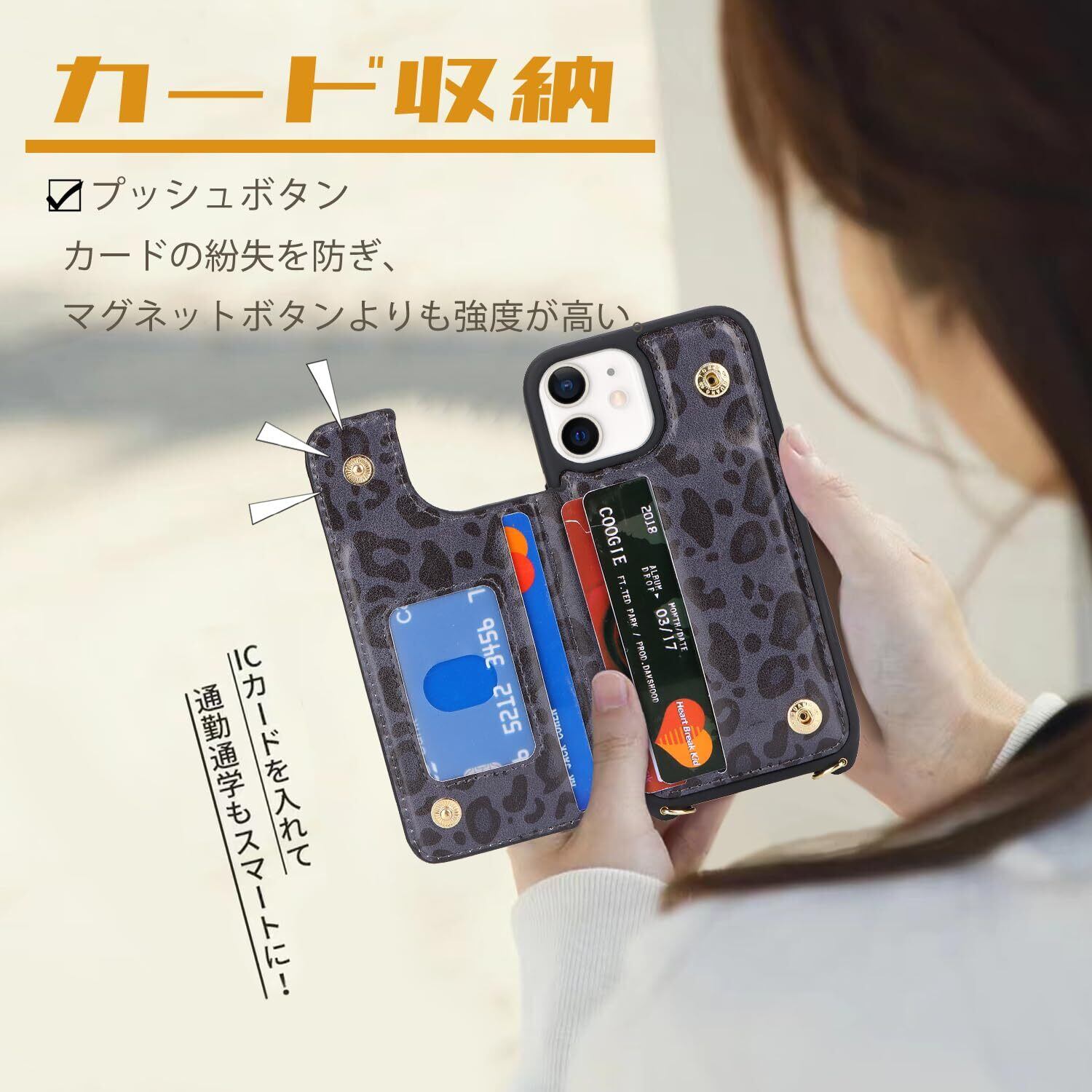 Havaya スマホショルダー iPhone 12 miniケース iphone12 mini ケース アイフォン12 ミニ ケース スマホケース iphone12mini ショルダー リング付き レザー 肩掛け カード収納(アイフォン12ミニ /あいふぉん12mini/いphone12mini/アイホン12ミニ 5.4インチ対応)-ブラック ヒョウ柄