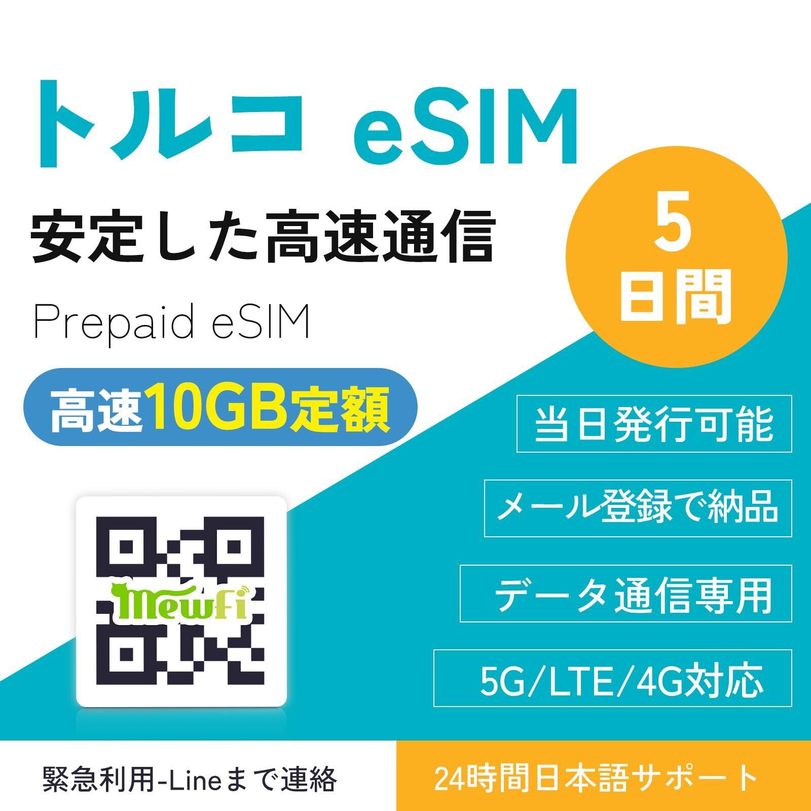 【トルコ eSIM】5日間 高速データ10GB 低速無制限 トルコ SIM データ通信専用 当日納品可能 QR簡单設定 緊急利用(Lineまで連絡)Turkey eSIM メール登録で納品 mewfi