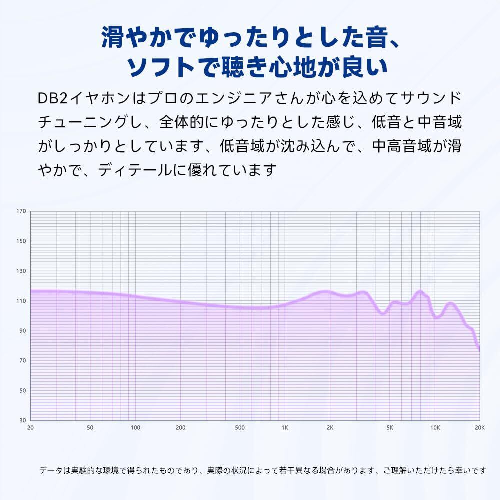 【ソフトで聴き心地が良い音質】DB2イヤホンの音質の特徴として全体的にゆったりとした感じ;低音と中音域がしっかりとしています、低音域が沈み込んで、中高音域が滑やかで、ディテールに優れています;音域はより広くなり、定位感・距離感の見事な表現を感じられるようになります