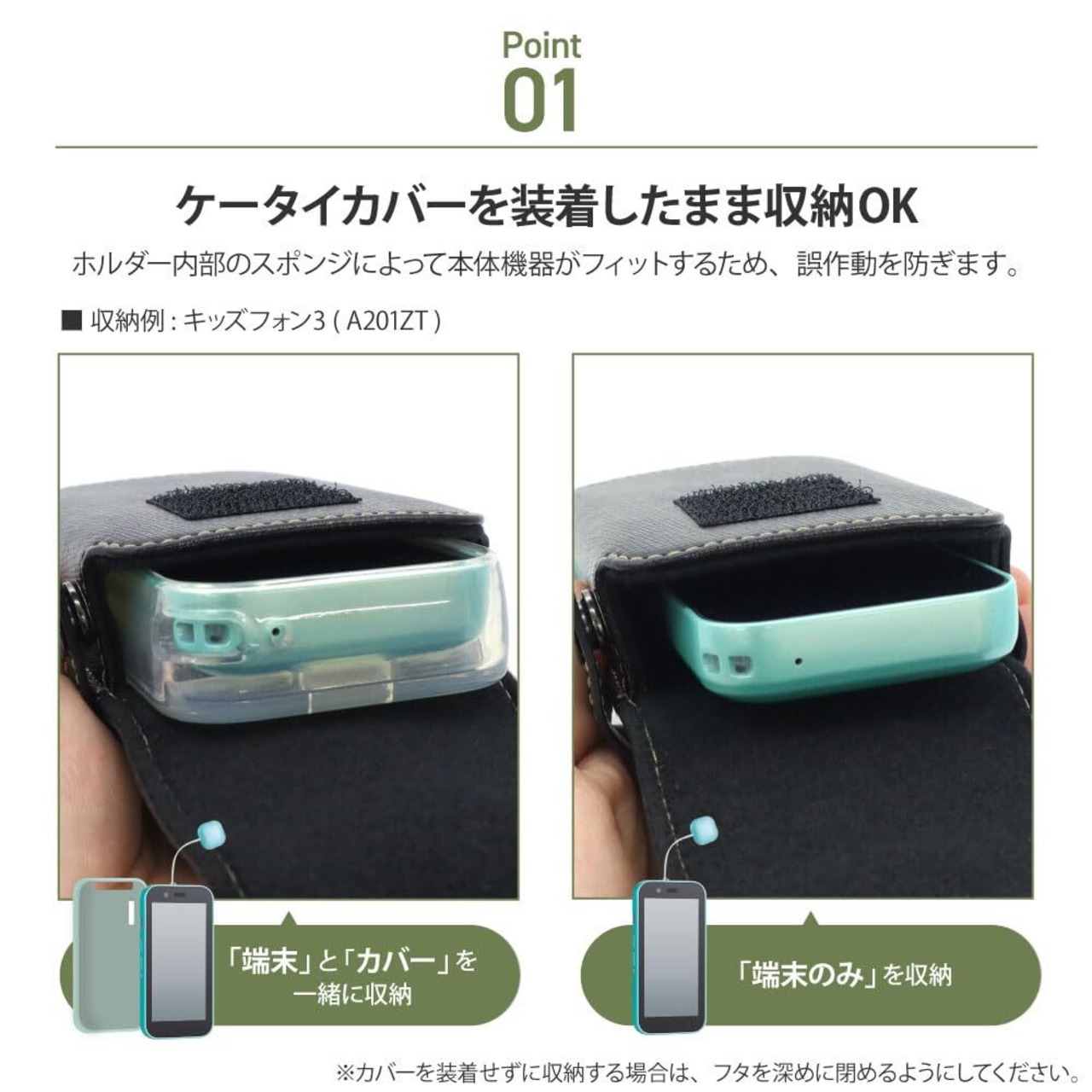 各社キッズ用ケータイに対応!「カバー付き」「カバーなし」どちらの状態でも収納可能です!
