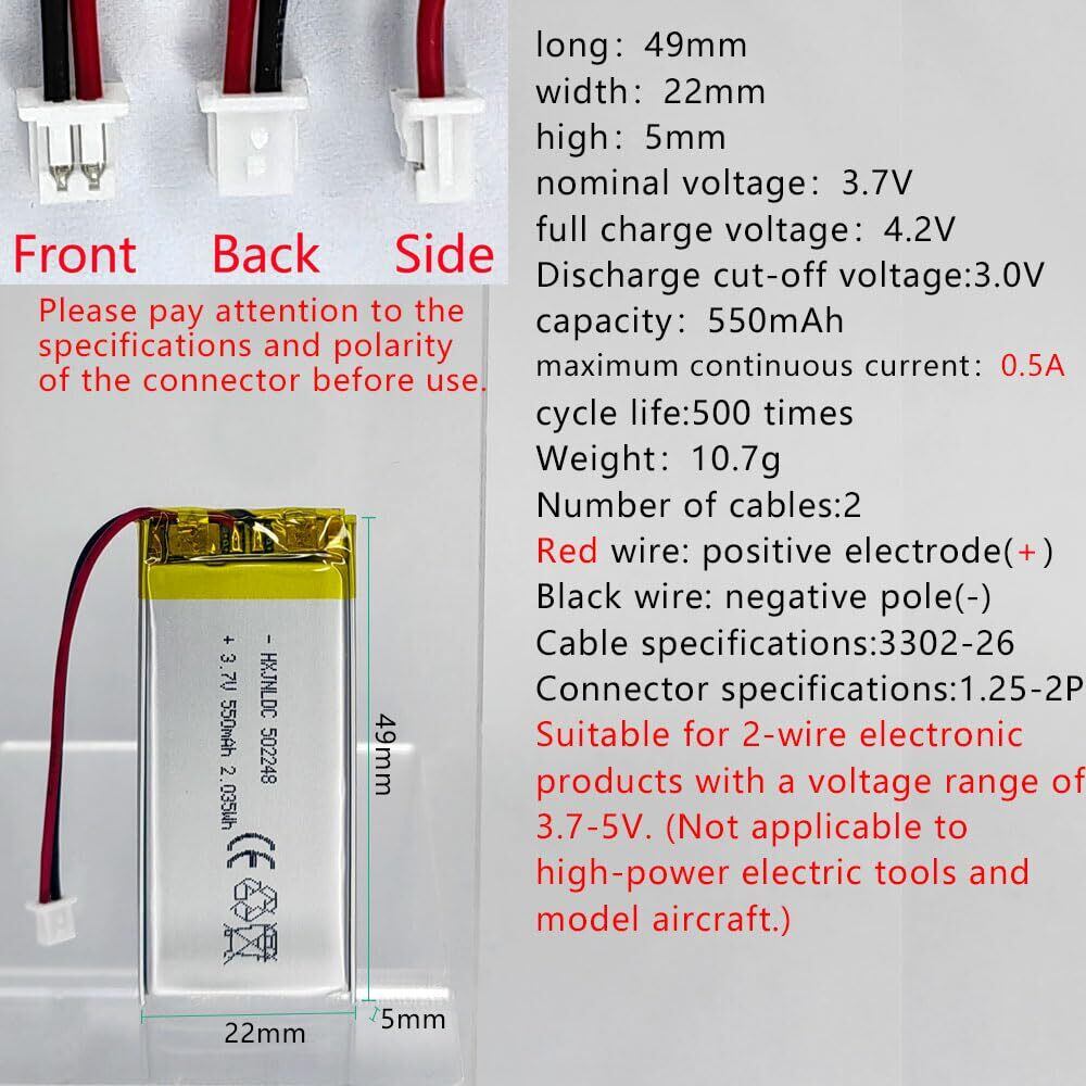 502248充電式リチウムイオンポリマー電池、公称電圧3.7V、フル充電電圧4.2V、容量550mAh、電力2.035Wh、サイズ:49×22×5mm(1.91×0.866×0.2inch)(長*幅*厚)、重量:10.72g(0.38oz)、最大電流:0.55A。過充電、過放電、過電流、短絡を防ぐことができます。