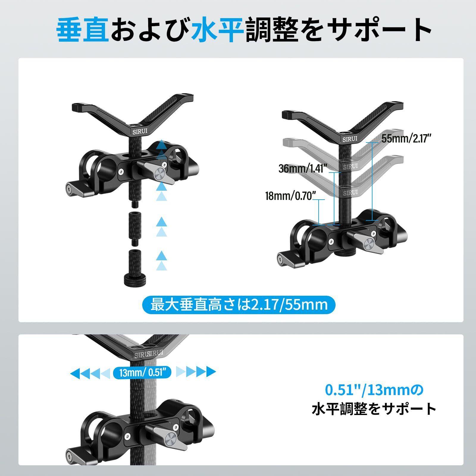 垂直および水平調整: 15mm レール レンズ サポートは、最大 2.2 インチ (55mm) の垂直調整だけでなく、0.51 インチ (13mm) の水平微調整も可能で、さまざまな撮影要件に対応します。
