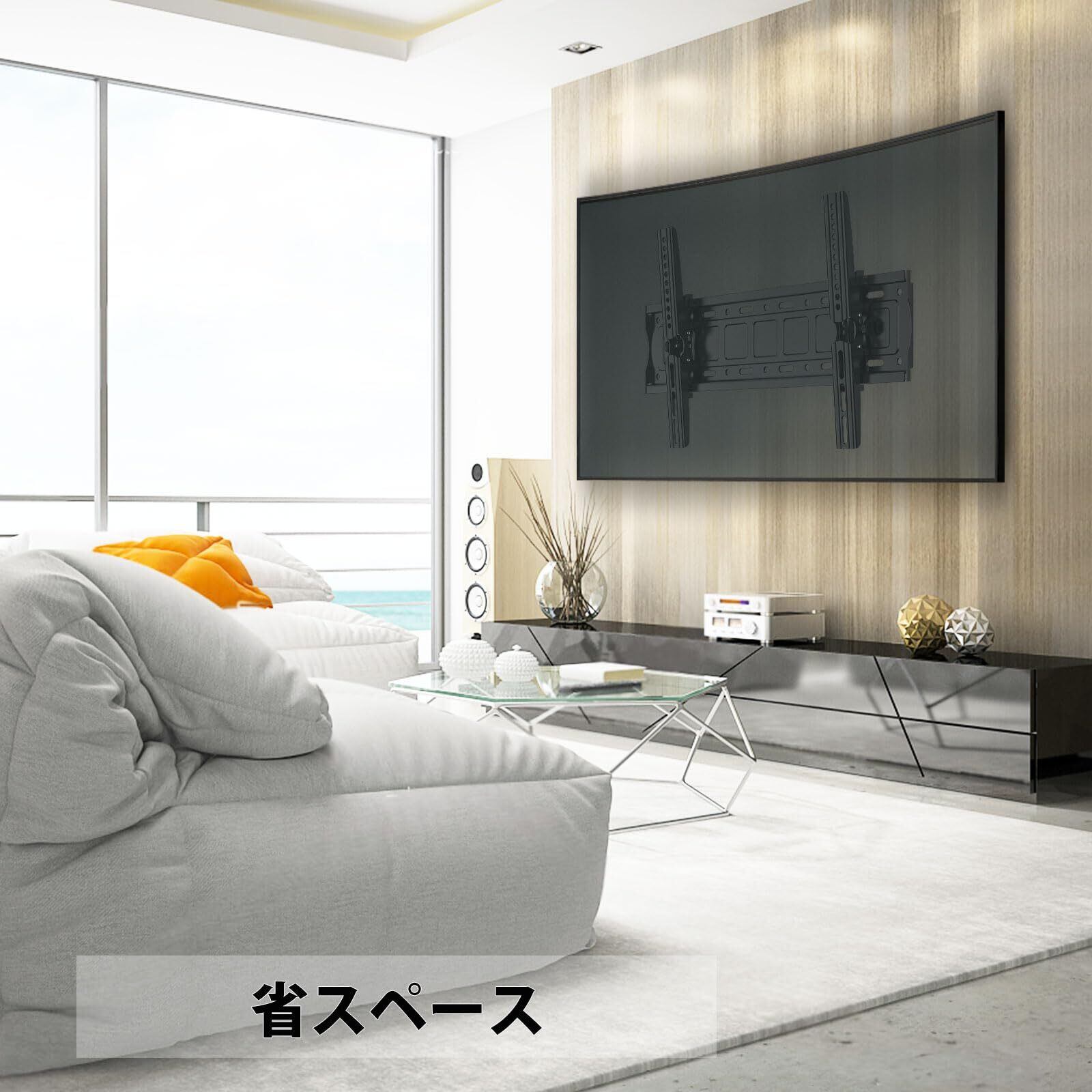 【省スペースデザイン】 スペースを節約するために、テレビを壁の近くに置いてください。 私たちの傾斜マウントは、テレビの背面を壁からわずか48mm(1.9”)離して保持し、滑らかで整頓された外観を実現します、省スペース。
