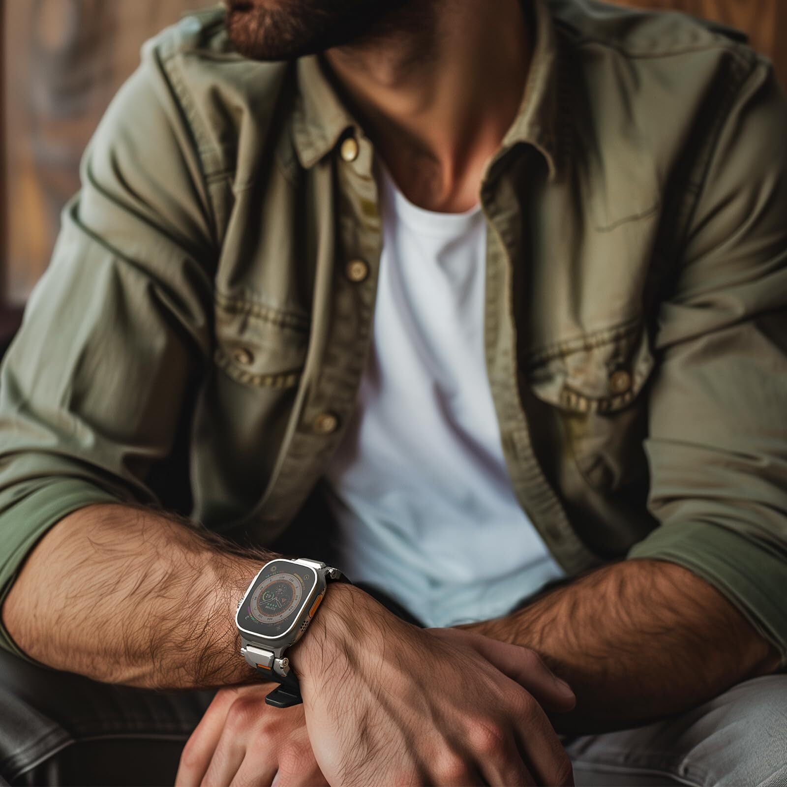 【ソフトTPU・ステンレス製尾錠】ソフト且つ丈夫なTPE材料を採用されており、長持ちしながら、さらなる快適さを提供します。ブラックメッキが施されたステンレス製尾錠とクラシックなシームレス縫い目が採用されており、Apple Watchをスタイリッシュでエレガントな外見に仕上げています。