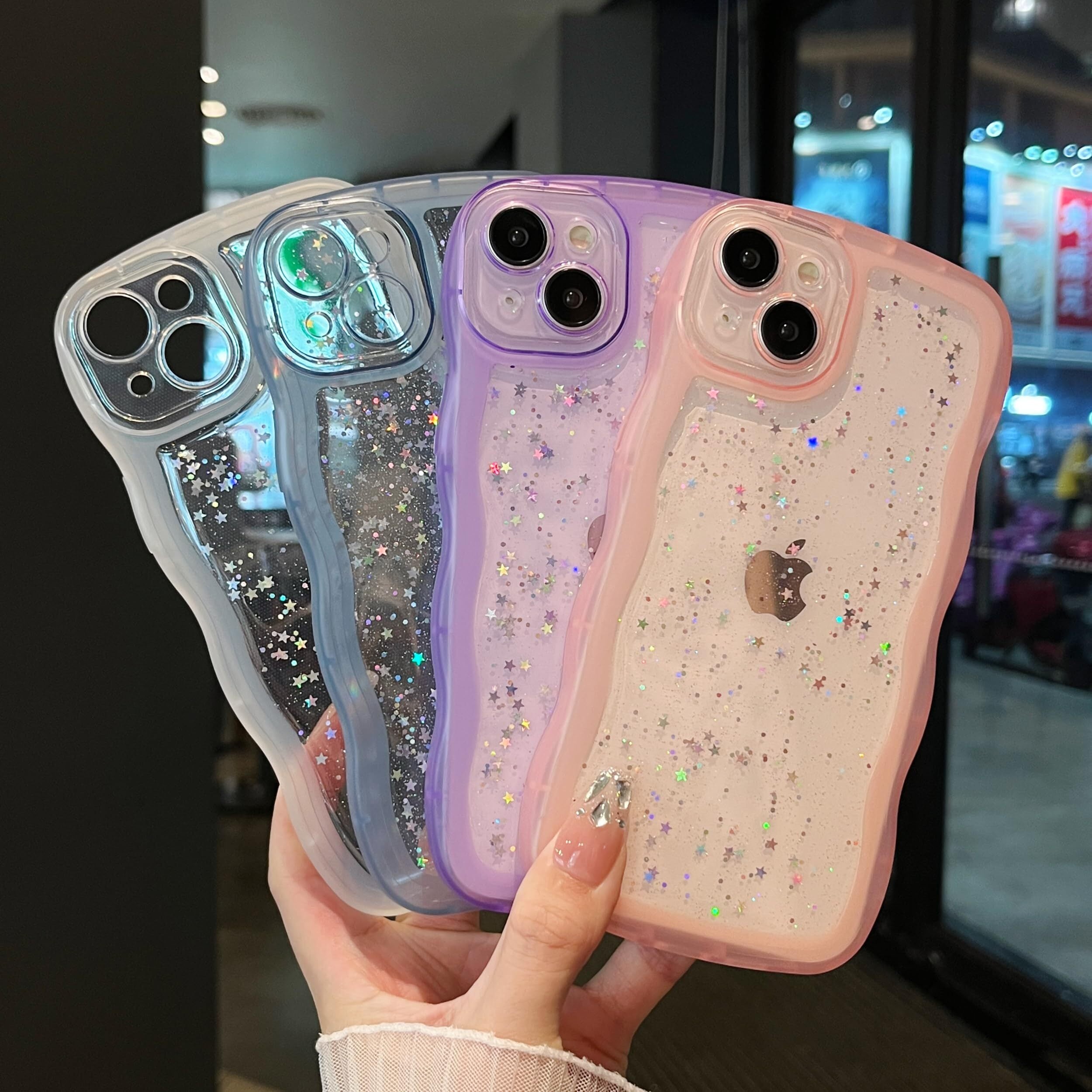 ✨【独特なデザイン】かわいいなグリッタースターデコレーションがあなたの携帯電話をより魅力的にします!波型のフレームが快適なグリップを提供。クリアな背面は、携帯電話本来の美しさを表現しています。 女の子と女性への素敵な贈り物。