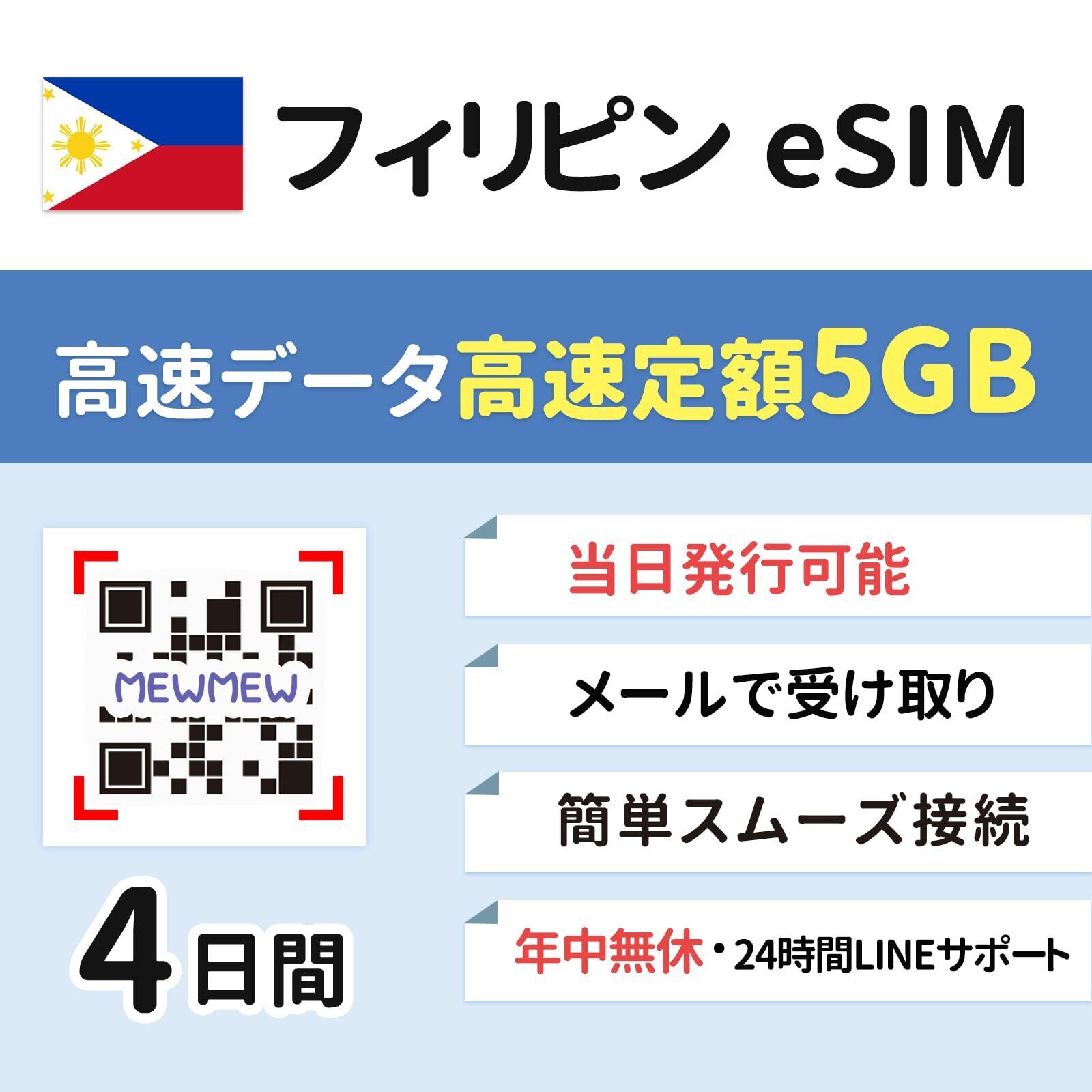 【フィリピンeSIM】4日間 高速データ5GB フィリピンSIMカード データ通信専用 QR簡单設定 メール登録で納品 フィリピンSIM 即日発行 緊急利用(Lineまで連絡) フィリピン eSIM MEWMEWホーム (4日間)