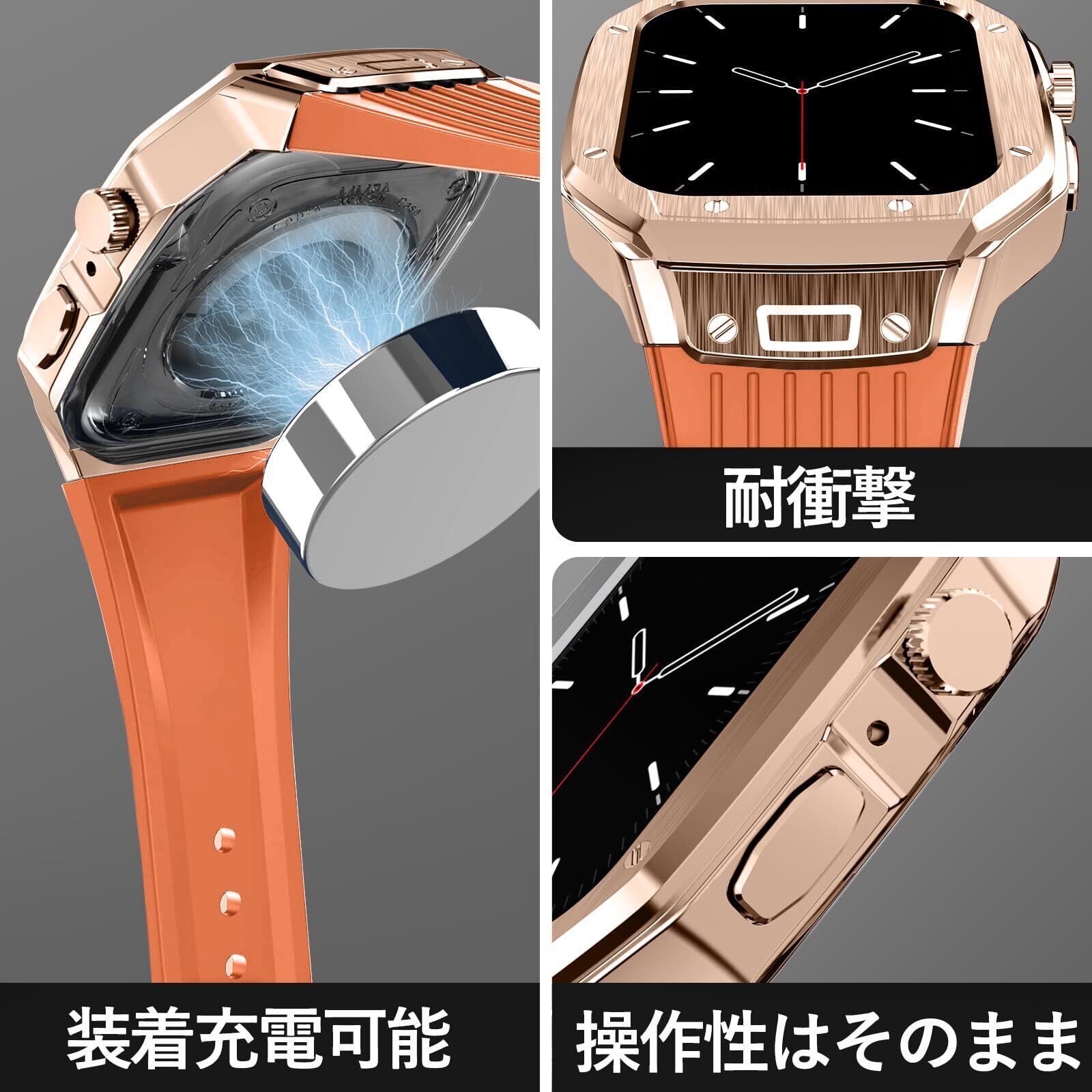 [YOFITAR] for Apple Watch バンドとケースと背面ケースの3in1一体型デザイン 45mm/44mm apple watch 一体型バンド Apple Watch Series 9/SE/8/7/6/5/4対応 メンズ かっこいい アップルウォッチ バンド カバー付き apple watch アクセサリー(45mm/44mm,ローズゴールドケースとオレンジベルト)