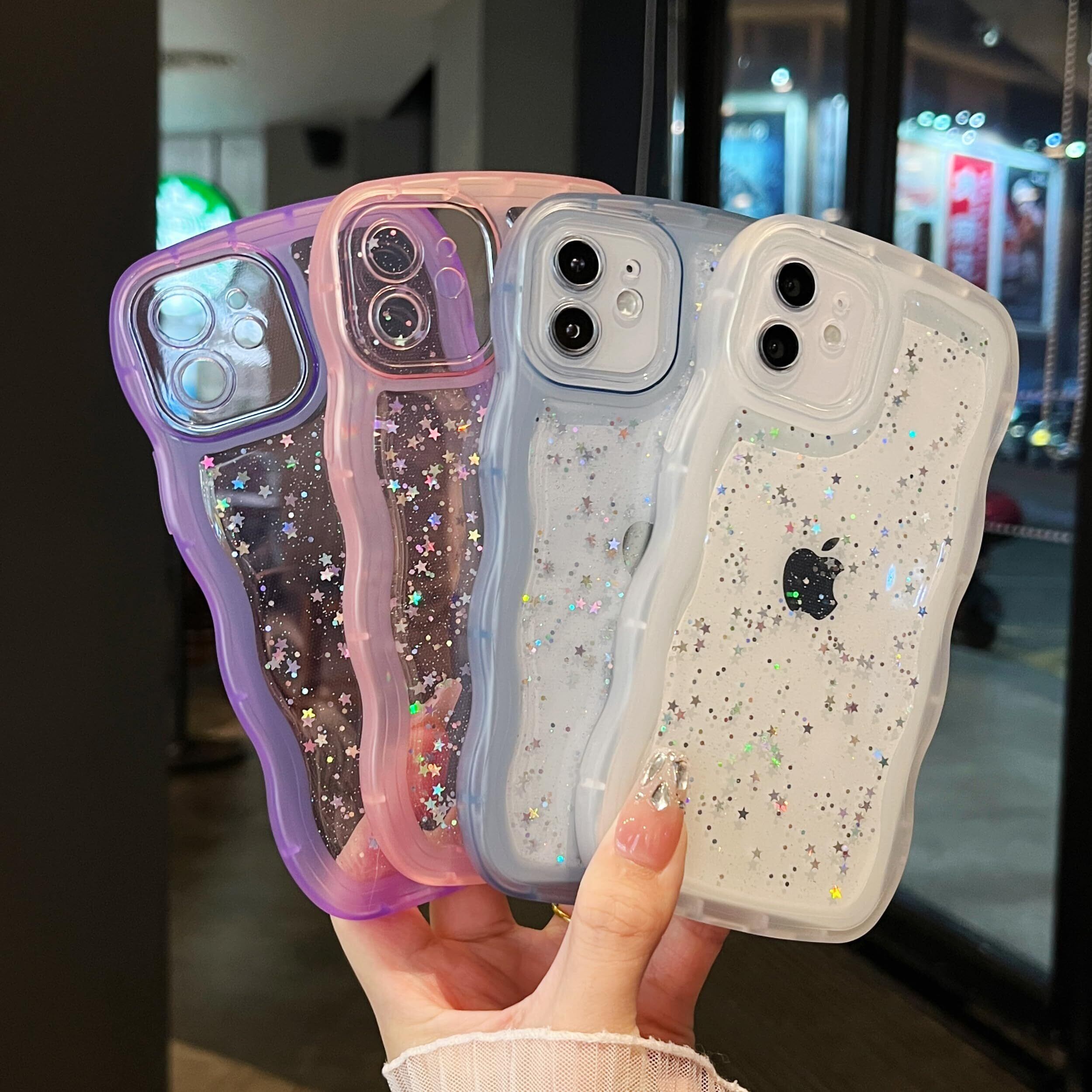 ✨【独特なデザイン】かわいいなグリッタースターデコレーションがあなたの携帯電話をより魅力的にします!波型のフレームが快適なグリップを提供。クリアな背面は、携帯電話本来の美しさを表現しています。 女の子と女性への素敵な贈り物。