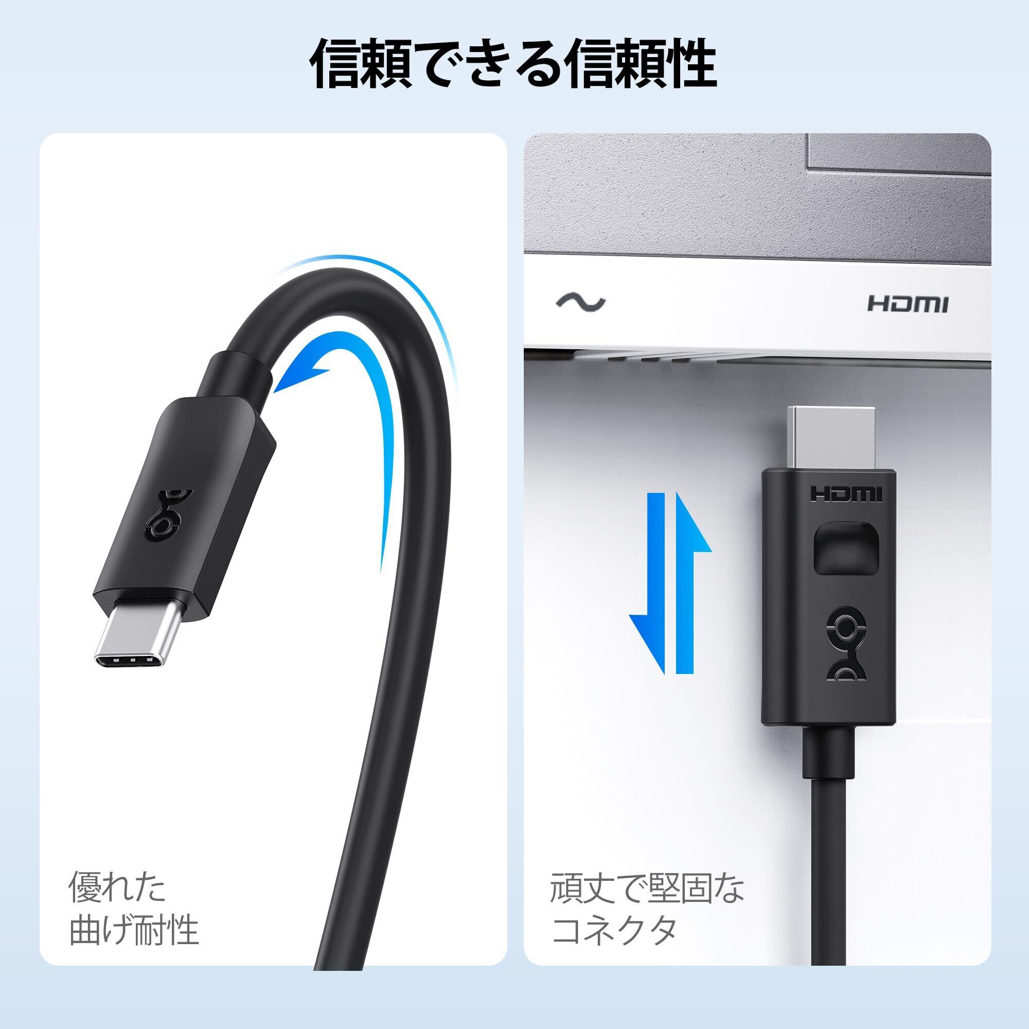 最新のHDMI 2.1テクノロジー: USB-CからHDMI 2.1ケーブルで、最新のHDMI 2.1規格に対応した高解像度接続を実現。8K@60Hzおよび4K@240Hzの映像解像度をサポートし、高性能ディスプレイやゲーミング環境に最適です。