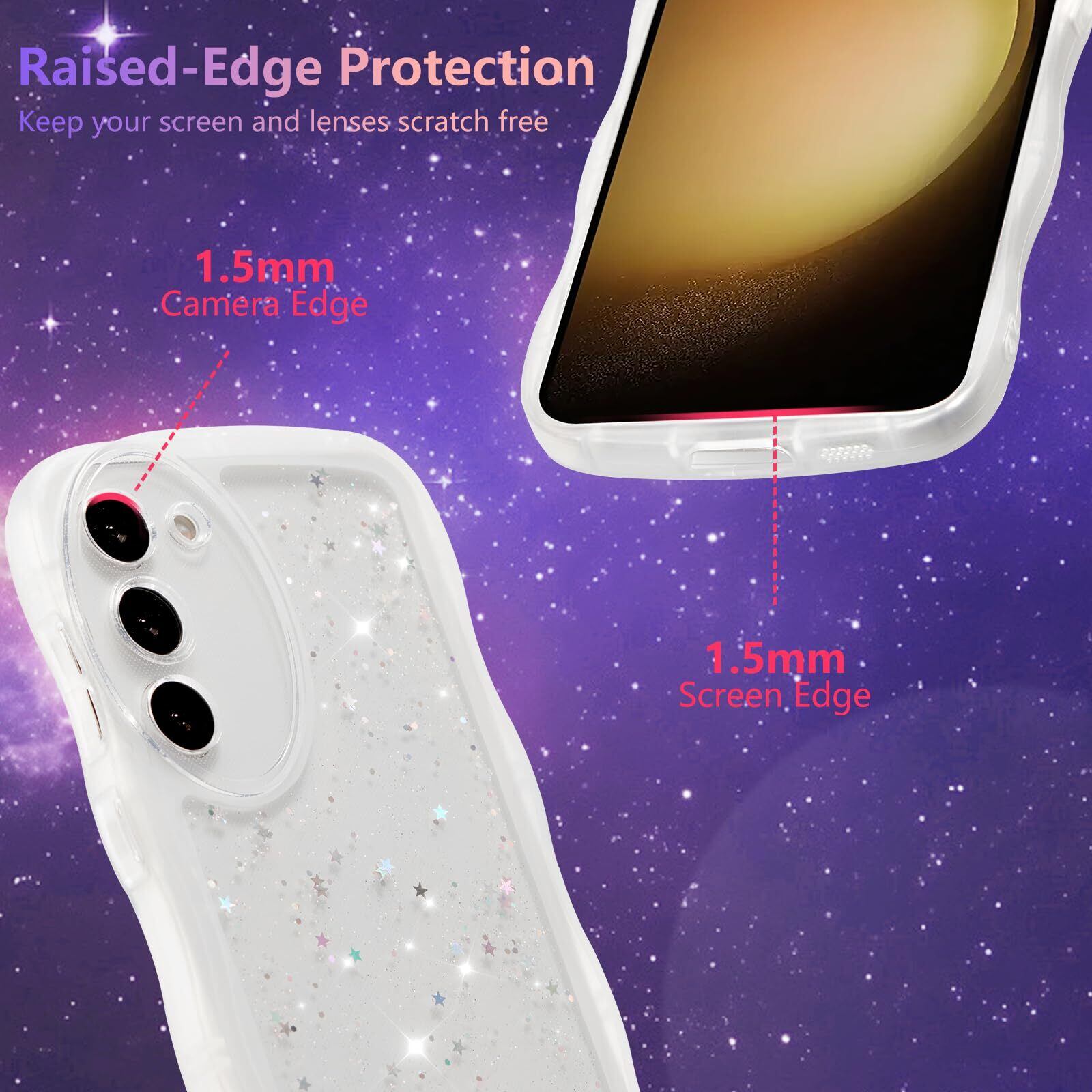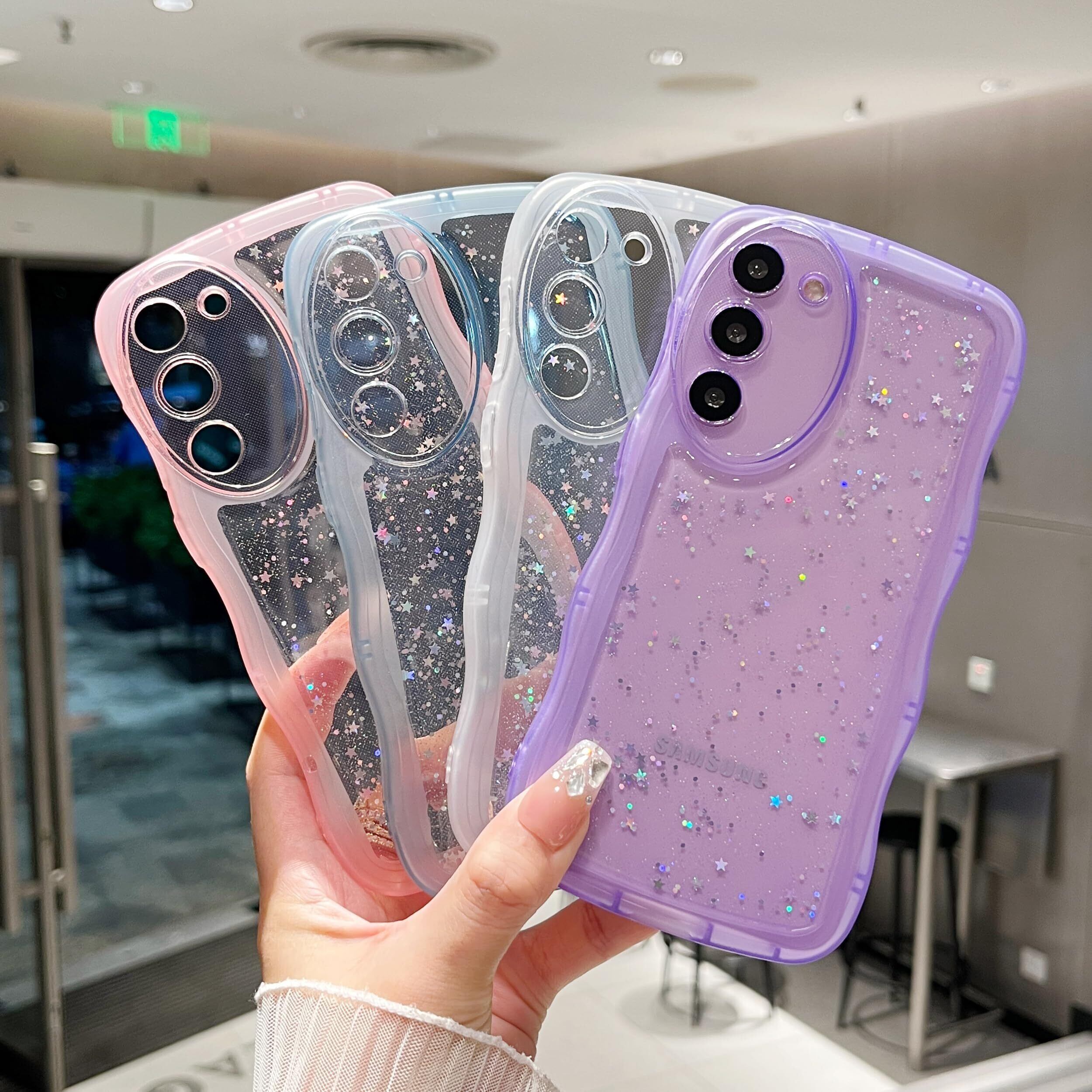 ✨【独特なデザイン】かわいいなグリッタースターデコレーションがあなたの携帯電話をより魅力的にします!波型のフレームが快適なグリップを提供。クリアな背面は、携帯電話本来の美しさを表現しています。 女の子と女性への素敵な贈り物。