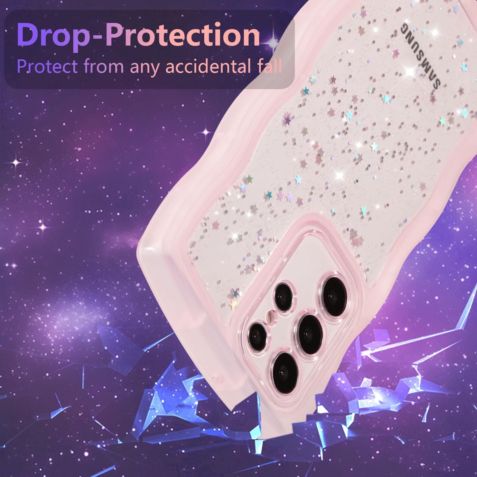 ✨【独特なデザイン】かわいいなグリッタースターデコレーションがあなたの携帯電話をより魅力的にします!波型のフレームが快適なグリップを提供。クリアな背面は、携帯電話本来の美しさを表現しています。 女の子と女性への素敵な贈り物。
