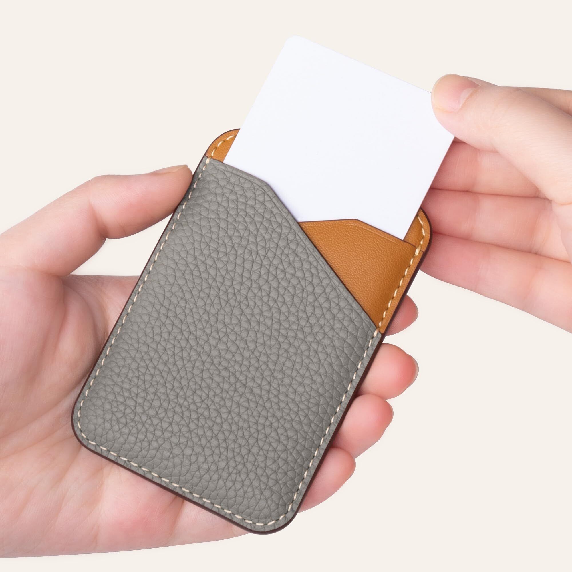 ヨーロッパの高級ブランドがこぞって採用している「シュリンクカーフレザー」と滑らかな触り心地の「スムースレザー」を組み合わせた、エレガントなカードケースです。MagSafe技術により、iPhoneの背面にマグネットで装着できるため、軽量かつスリムなデザインで、気軽にお出かけいただけます。