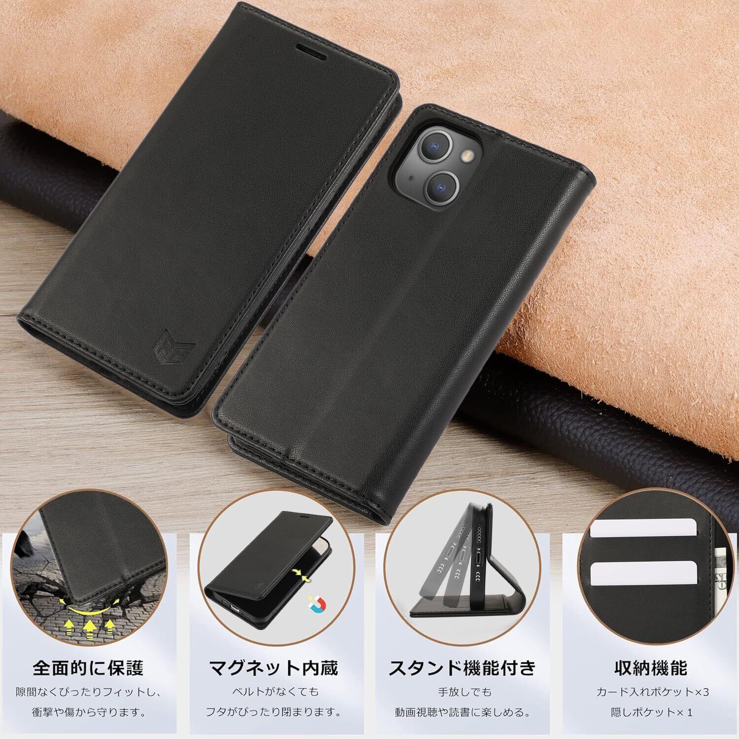 FeeY iphone15ケース 手帳型 Iphone15手帳 ケース 耐衝撃TPU素材カード収納 マグネット内蔵スタンド機能付き アイフォン15携帯カバー全面保護 iPhone 15スマホケース 5G 6.1インチ対応, ブラック