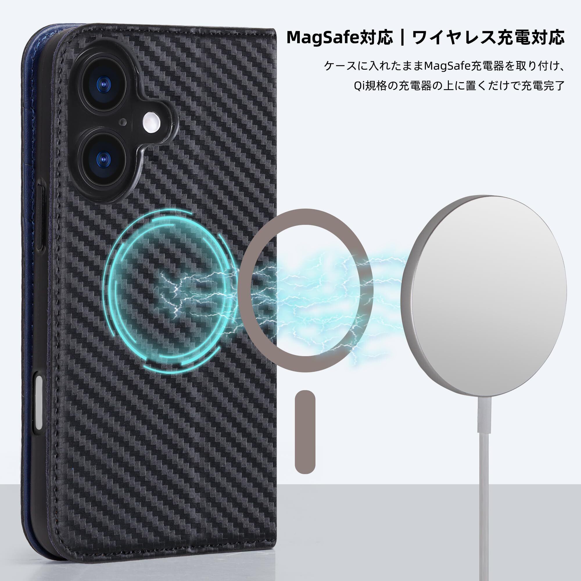 VISOUL iPhone16 対応ケース 手帳型 本革 レザー スマホケース アイホン16ケース MagSafe対応 横置きスタンド機能付き手帳型ケース カード収納 携帯ケース 全面保護 マグネット内蔵 柔軟なTPU素材 あいふぉん16 カーボンレザー アイフォン16 ネイビー
