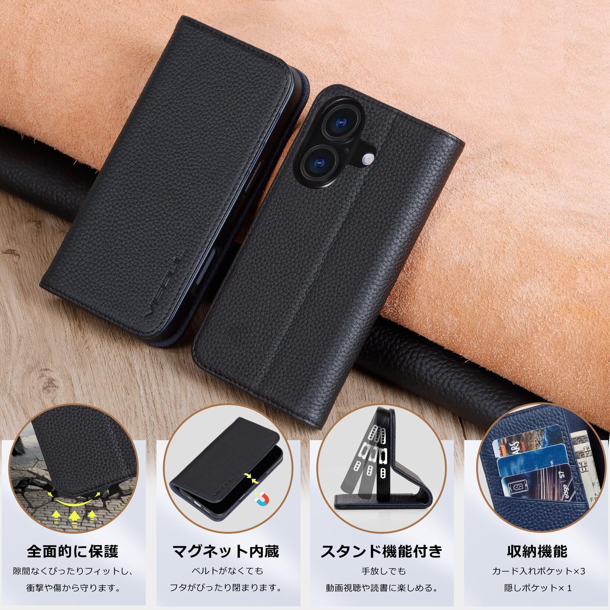 VISOUL iPhone 16 対応 ケース 手帳型 本革 MagSafe対応 スマホケース アイフォン16 手帳型 レザー アイホン16ケース 横置きスタンド機能 カード収納 携帯カバー 全面保護 マグネット内蔵 柔軟なTPU素材 アイホン16 ネイビー