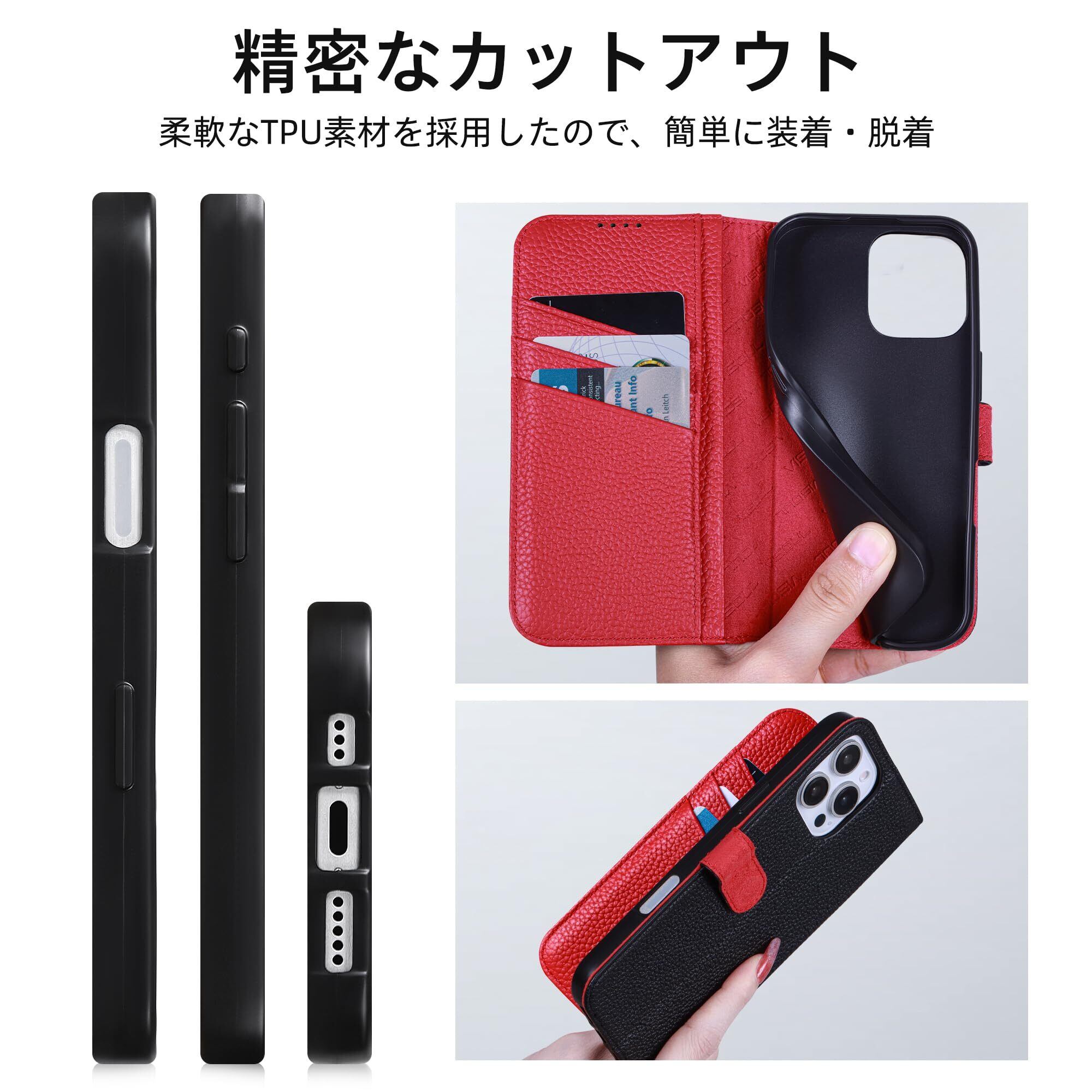 VISOUL iPhone16Pro 対応ケース 手帳型 本革 MagSafe対応 アイフォン16プロ レザーケース スマホケース iPhone16プロ ベルトマグネット型 携帯ケース iphone16 Pro ケース 横置きスタンド機能 カード収納 全面保護 柔軟なTPU素材 アイホン16 Pro レッド
