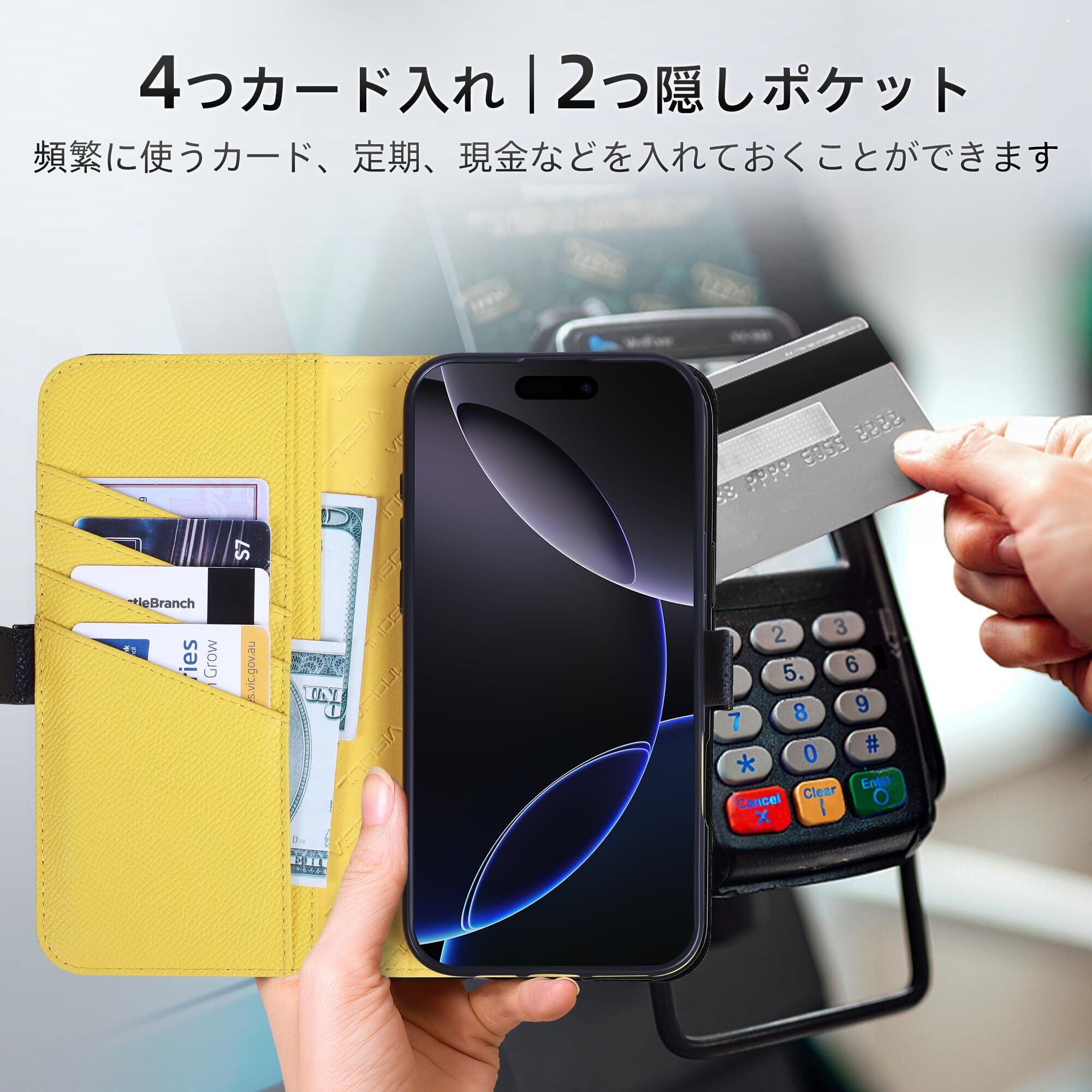 VISOUL iPhone16ProMax 対応ケース 手帳型 本革 アイフォン16プロマックス 手帳型ケース MagSafe対応 スマホケース サイドマグネット型 携帯ケース 16promaxレザーケース 横置きスタンド カード収納 全面保護 柔軟なTPU素材 アイホン16 ProMax レモン