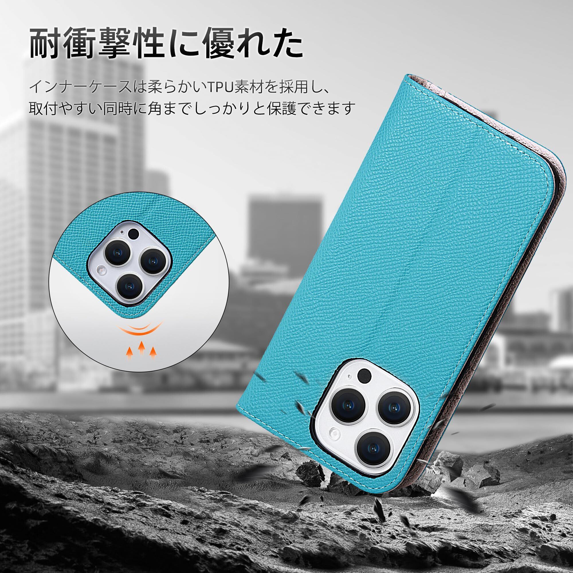 マグネット内蔵・iPhone16Pro対応本革手帳型ケース:背面だけでなく、画面を覆っているため、画面から直接地面に落ちる場合は、スマホの画面を保護してくれるので安心といったイメージがあります。カバーの面積が広くなり、カバーの外側や内側を有効利用できる点も手帳型の魅力の1つです。マグネットが内蔵されているので、ベルトがなくてもフタがピタッと閉まります。シンプルなタイプで留め具がなく、撮影モードでも邪魔しません。耐衝撃に強いTPU素材:カバー部分は軽量と耐衝撃を兼ね備えるTPU素材を採用して柔らかいTPUカバーは取り付け・取り外しが簡単で、スマホ本体への損傷の心配ありません。