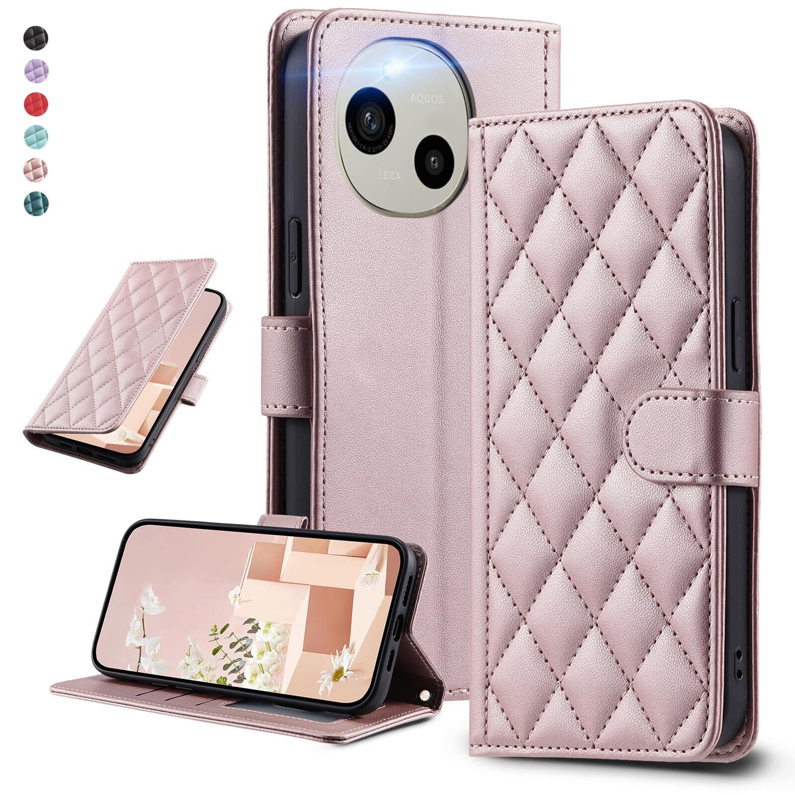 UnivoColors SHARP AQUOS R9(SH-51E)キルティングレザー調 手帳型ケース エレガント 高質PU マグネット開閉式 カード収納機能 スタンド機能 液晶全面保護 レンズ保護 ストラップ付属(ゴールドピンク)