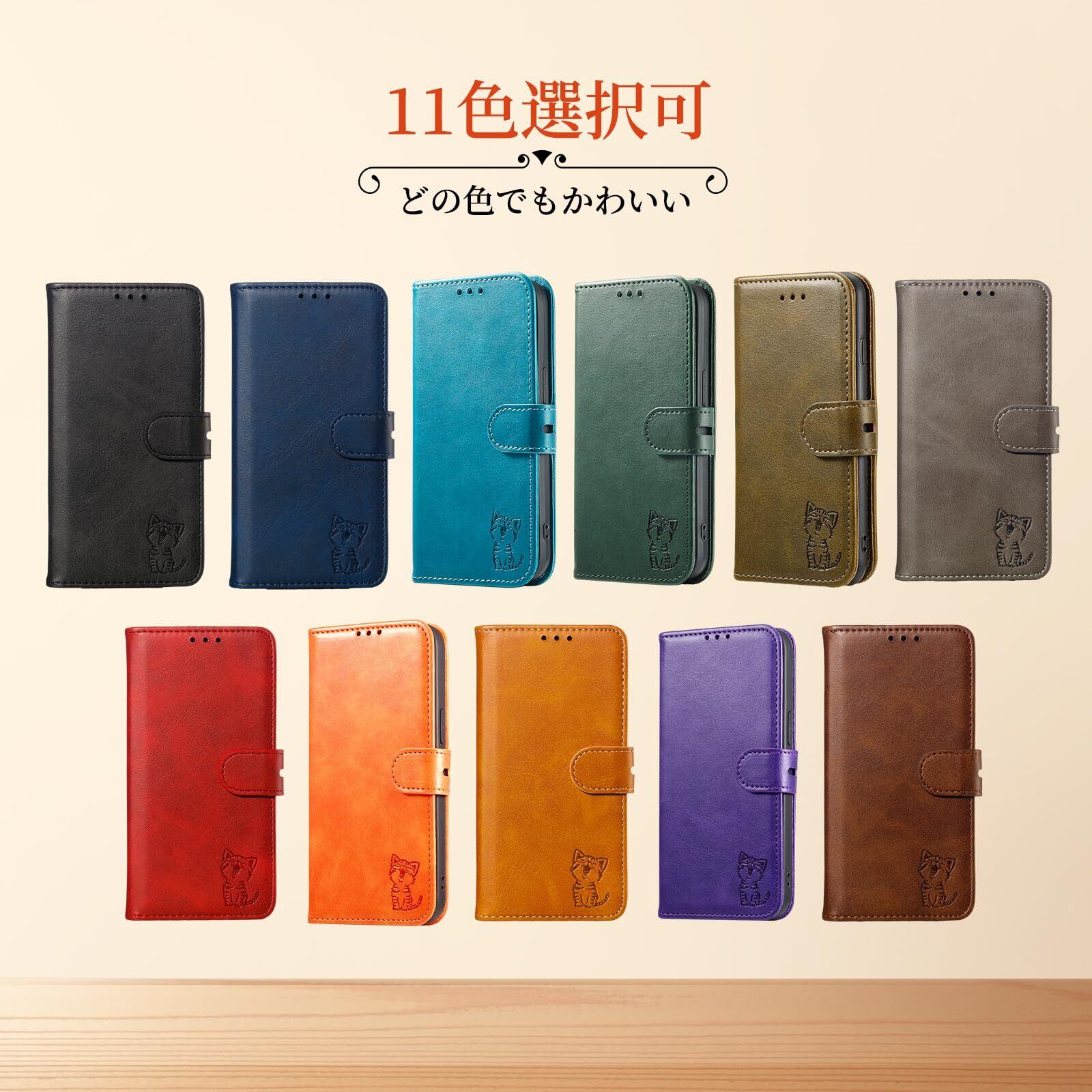 【素材:高級PUレザーとアップグレードしたTPUケース】本製品は厳選されたPUレザーを採用し、エンボスの猫柄が特徴です。レザー自体が水分をはずみ、汚れやシミが付きにくい仕様です。肌触りのような感じで、手汗が出てきても滑りにくいです。インナーケースは弾力あるTPU製で、ケースの一番右したのところにストラップホールもあり、お好きな小物とかお付けられます。柔らかく耐衝撃が強くなり、着脱もスムーズで、不意な落下からスマホをしっかりお守れます。