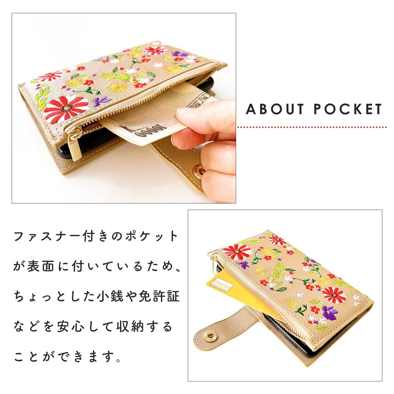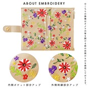 AQUOS wish4 SH-52E A402SH SH-M27 専用 手帳型ケース。小銭や免許証等の収納に便利なファスナー付きの手帳型ケースです。上品なサフィアーノ生地に、色鮮やかな花柄の刺繍を施しています。