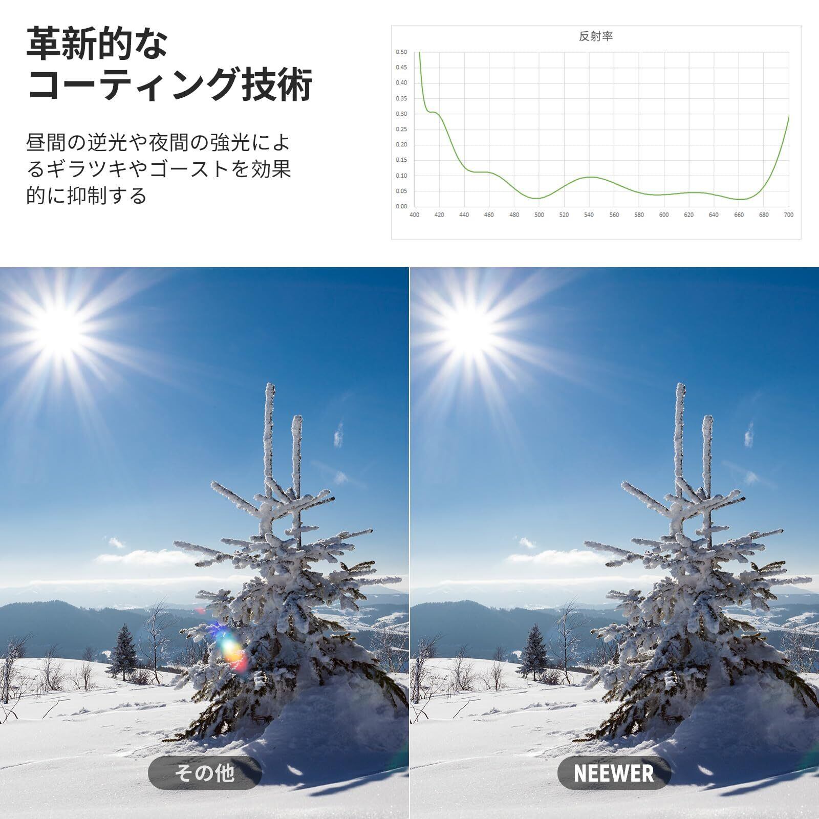 【レンズ保護と忠実な色合い】NEEWER 55mm超低反射UVレンズフィルターは、埃、傷、指紋、衝撃からレンズを保護します。革新的なコーティング技術で作られ、日中の逆光や夜間の強い光源撮影によるギラつきやゴーストに効果的に抵抗し、驚くほど鮮明で忠実な色彩の画像や映像を撮影できます。