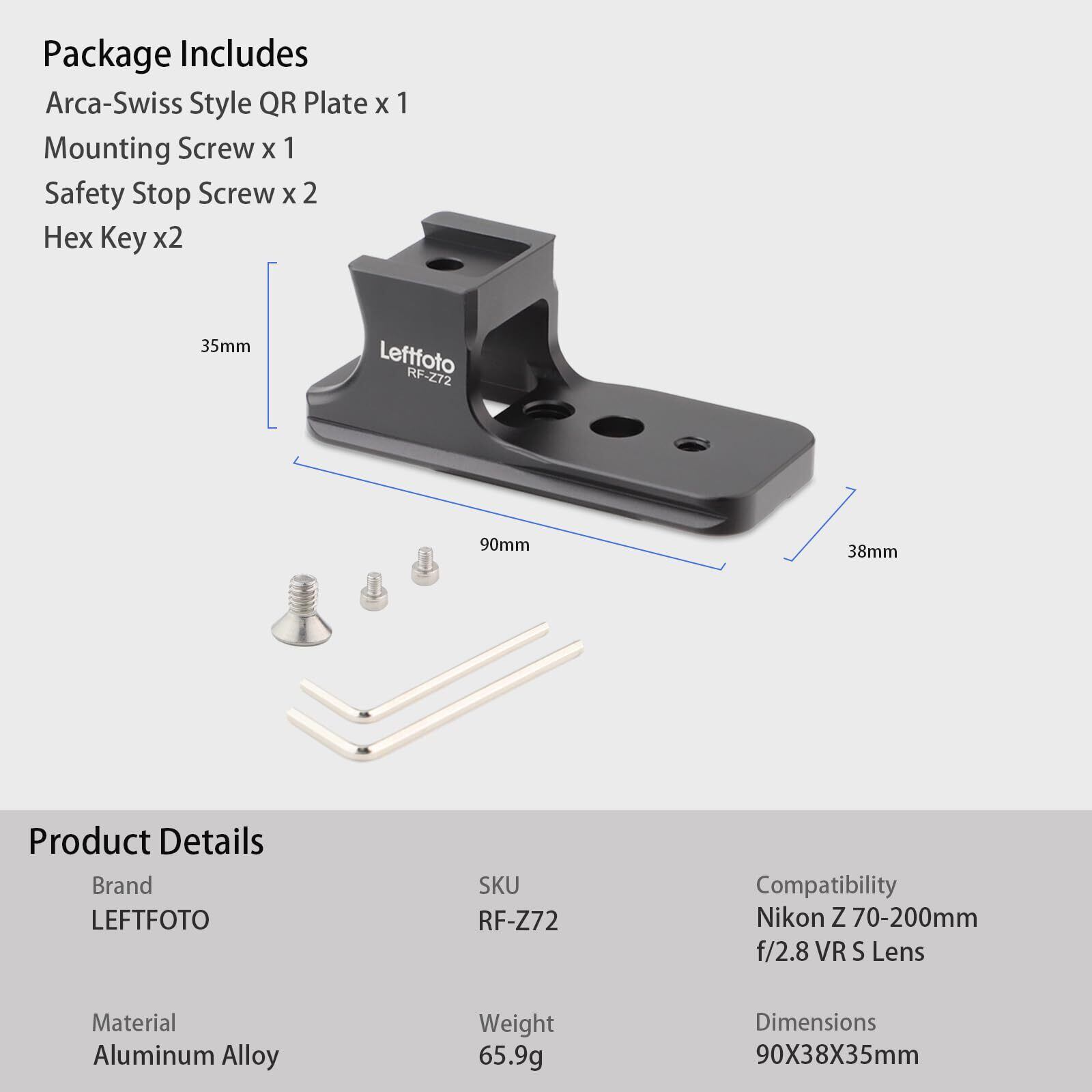 取り付け方法: 1. レンズからファクトリーフットを取り外します 2. Leftfoto レンズフット交換部品を1/4-20ネジを使用してレンズに取り付けます 3. 接続が確実になるまでネジを締めますただし、締めすぎないでください 4. 安全停止ネジを2本取り付けます (安全停止ネジは不要です)