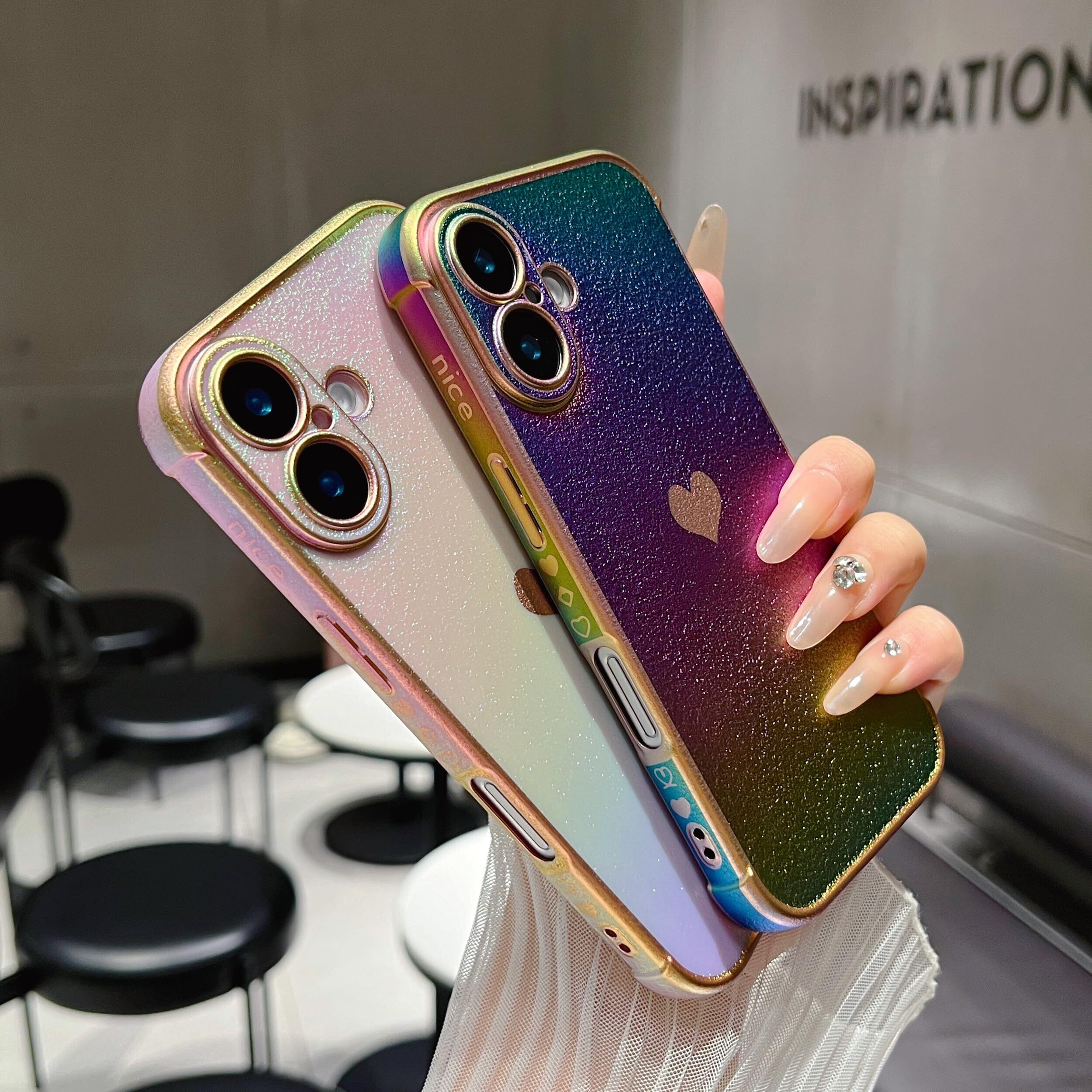 【虹色デザイン】電気メッキ技術により、縁と小さなラブハートパターンを装飾し、メッキされた縁は決して色褪せず、ケース全体が光沢があり、異なる動きや光によって色が変化します; すべてがこのiphone16ケースをよりスタイリッシュにし、目を引く;女の子と女性のための素敵な贈り物。