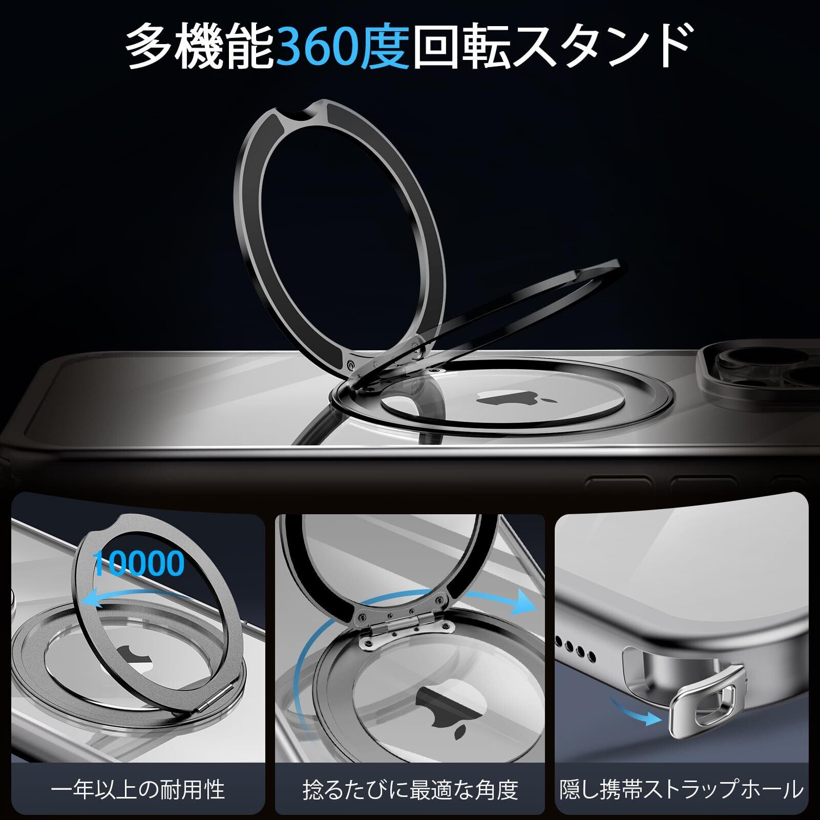 iPhone 15 Pro 用 ケース ダブルリング付き ショルダー ストラップ付き 多機能360度回転スタンド MagSafe対応 ワイヤレス充電対応 耐衝撃 いphone15pro用ケース 薄型 透明 PC + 軽量 シリコン TPUバンパー おしゃれ スマホケース (グレー, iPhone 15 Pro)