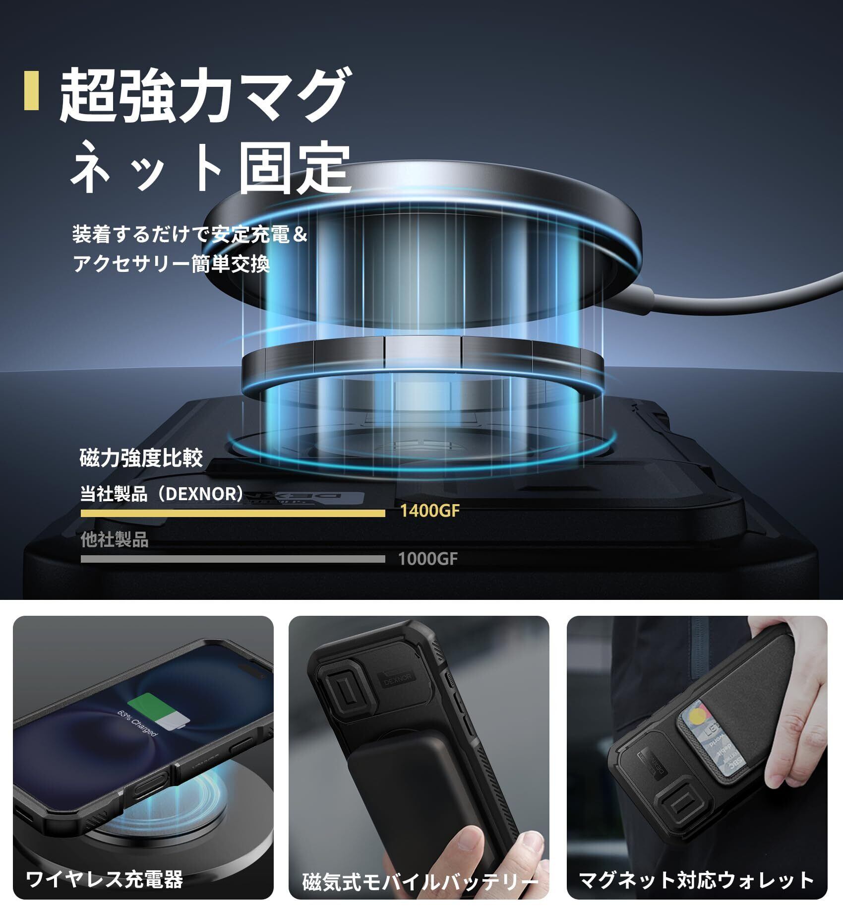 【強力マグネット機能】最大1,400gの磁力を実現する「マイティーマグネット」搭載。ワイヤレス充電器やカーマウントなど、あらゆる磁気アクセサリーに確実に吸着。どんな状況でもスマートフォンを安全に固定します。