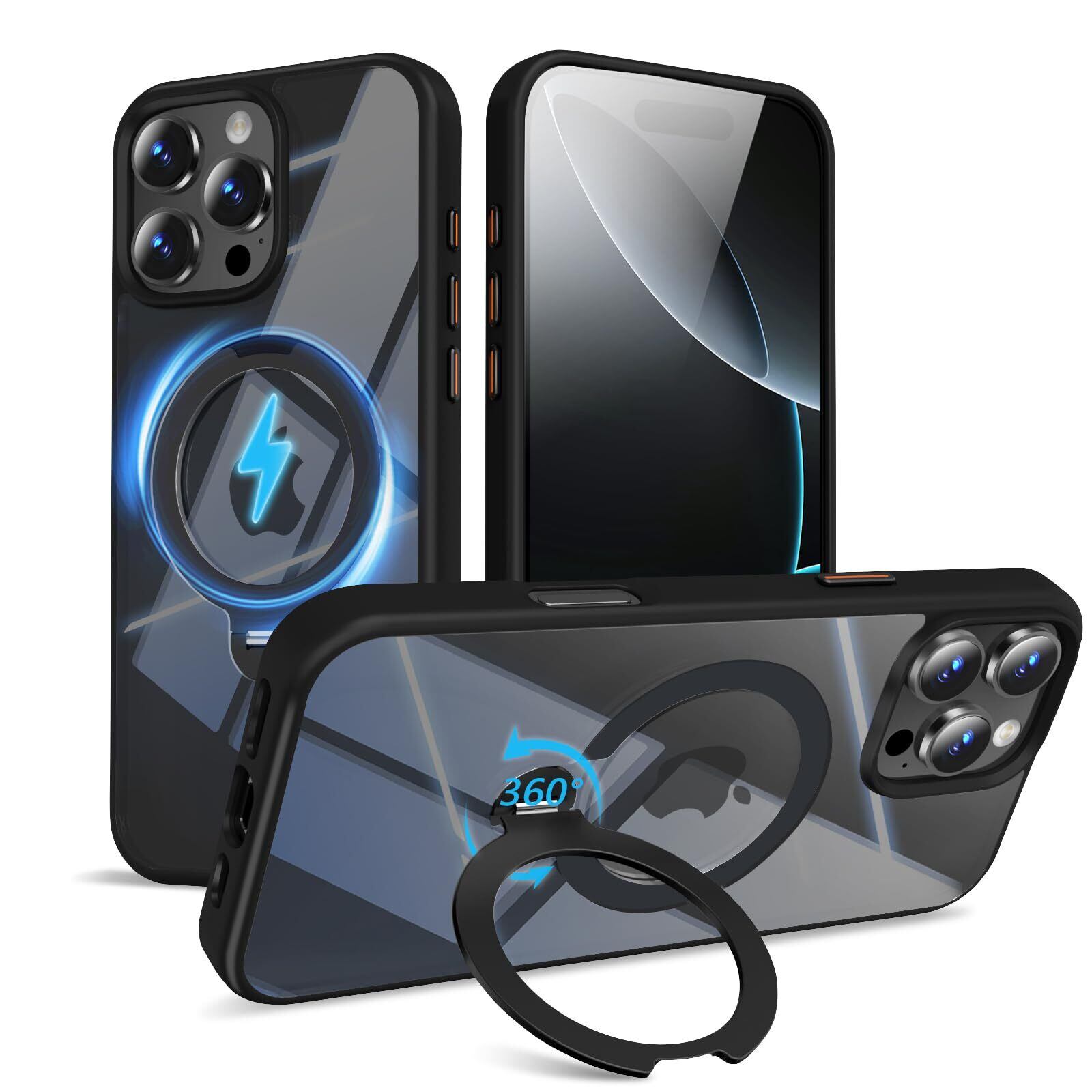 【定点360度回転スタンド】KWATUNG iphone 16 pro 用 ケース MagSafe対応 ワイヤレス充電対応 いphone16pro用 ケース magsafe 対応 リング マグネット搭載 iphone16プロ用ケース 耐衝撃 米軍MIL規格 アイホン16プロ用ケース 全面保護 多機能スタンド 隠し収納式 縦横両対応 ストラップホール付き 6.3インチ クリア透明の背面【ブラック】