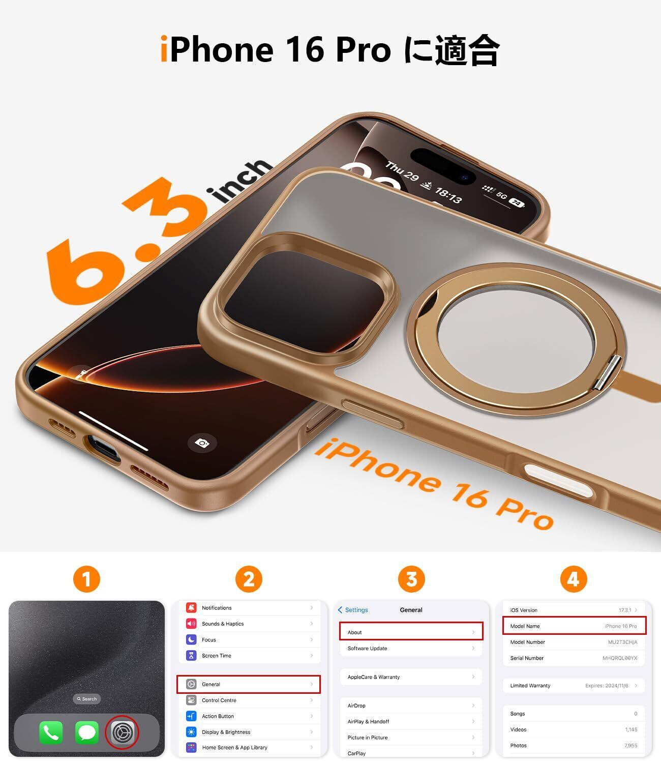 JUESHITUO 3 in 1 iPhone 16 Pro 用 ケース スタンド ケース 360°回転可 MagSafe充電対応 [1Xスクリーン保護+1Xレンズ保護]付き いphone16pro ケース 米軍MIL規格 黄変防止 半透明 アイフォン16 pro 用 ケース 6.3インチ デザートチタニウム ゴールド
