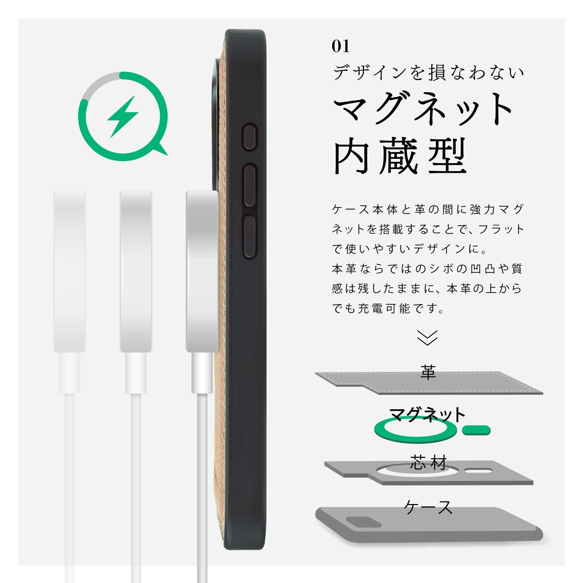 「シンプルで美しい」を追求したMagSafe対応本革製スマホケースです。素材に使用しているシュリンクカーフレザーは上品で艶のある風合いが魅力です。本革では珍しい個性派色、ベーシックな定番色。お好みやお使いのシーンに合わせてお選びくださいませ。