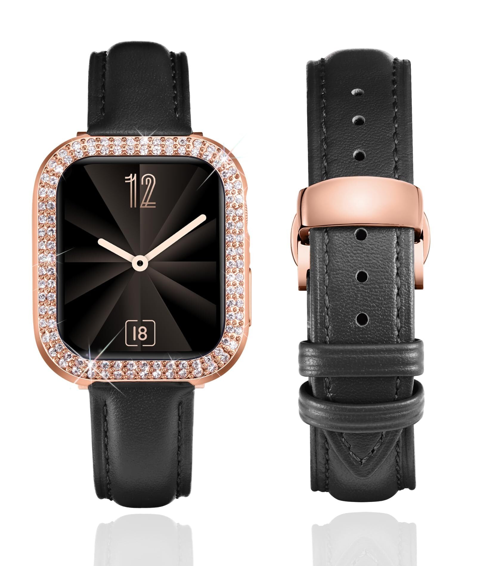コンパチブル Apple Watch バンド 40mm 41mm 44mm 45mm コンパチブル アップルウォッチバンド レザー 革ベルトキラキラダイヤモンド保護ケースー付きレディース コンパチブル iWatch Series 9/8/7/SE2/SE/6/5/4(45mm,ブラック/ローズゴールド)