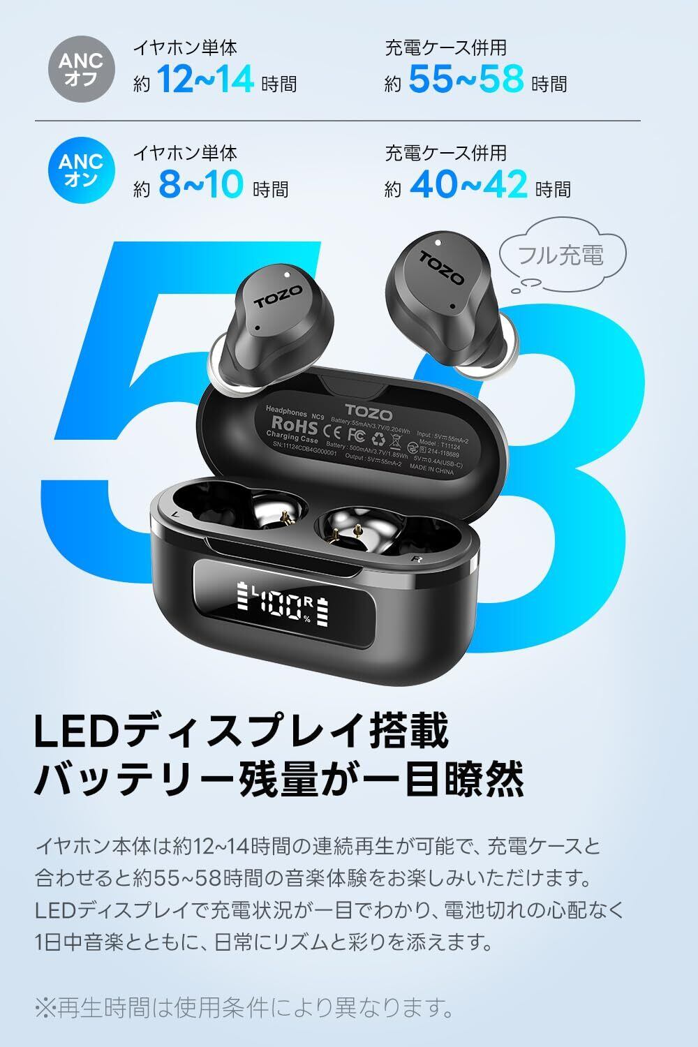 TOZO NC9 完全ワイヤレスイヤホン 極上の音体験 臨場感あふれるサウンド ANC/ENCノイズキャンセリング 最大45dB低減 Bluetooth5.3 IPX8防水 Type-C急速充電 最大55時間再生 通話ノイズリダクション 自動ペアリング iOS/Android対応 音声アシスタント対応 専用アプリでカスタムEQ設定 密閉型イヤホン ブラック