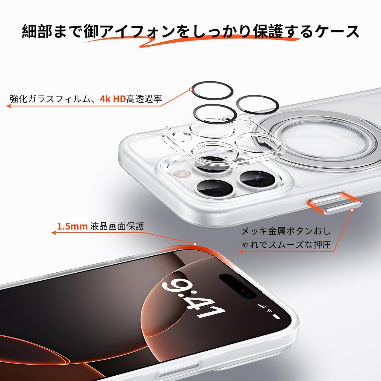 【マグネット搭載で強力な磁力吸着】ケースのスタンドに強力なN52マグネットを搭載して、マグセーフ対応の様々なアクセサリーを適用します。MagSafe対応の充電器や車載ホルダー、あらゆる充電に安定で接着ができ、料理中に冷蔵庫に吸い込むことができ、映画を見たりして家族のために楽しく食事を作ることができます。(Qi充電には対応しませんのでご注意ください)