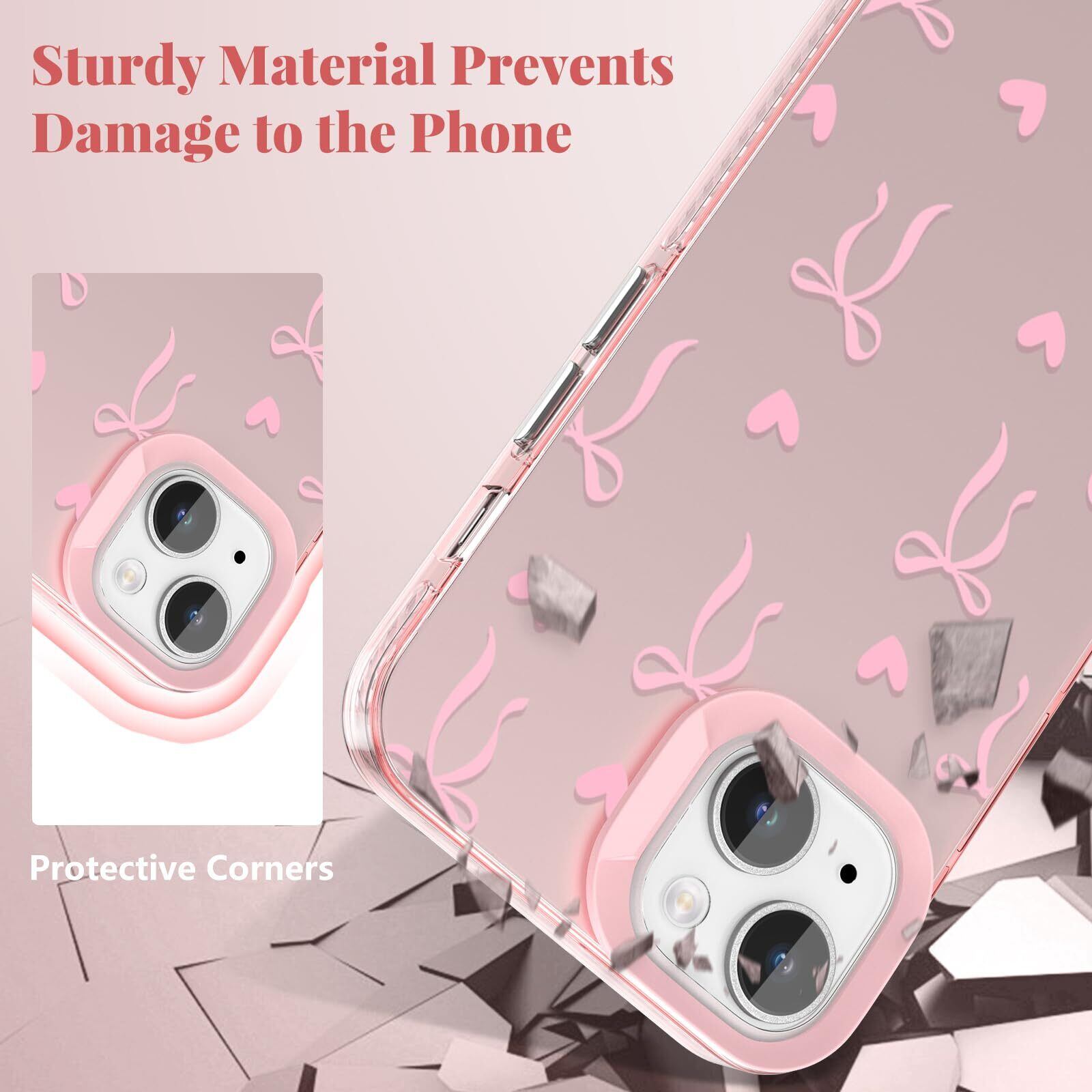 iPhone 13/14に対応、購入前に機種をご確認ください。背面は硬く、側面は柔らかいTPU製。ピンクを背景にしたかわいい蝶結びの模様が、携帯電話の美しさを引き立てている。