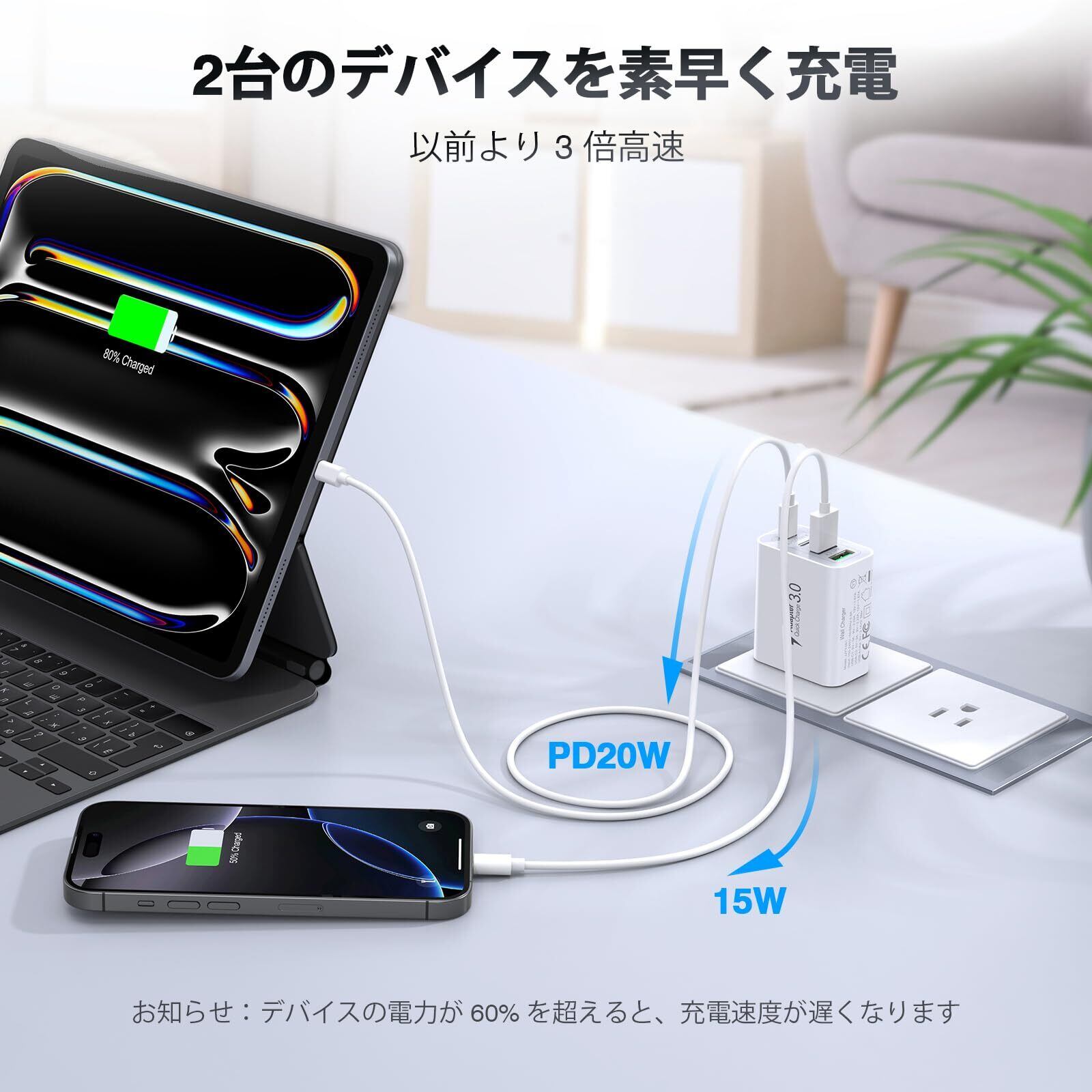 【40W USB 急速充電器】: Type-C 充電器は、最大 40W の合計電力で Power Delivery および Quick Charge 3.0 急速充電機能をサポートします。USBポートは 3.1 A/5 V の出力電力を提供し、USB-C ポートは 20W の充電速度を提供します。わずか 30 分で iPhone デバイスを 0% から 58% まで充電できます。
