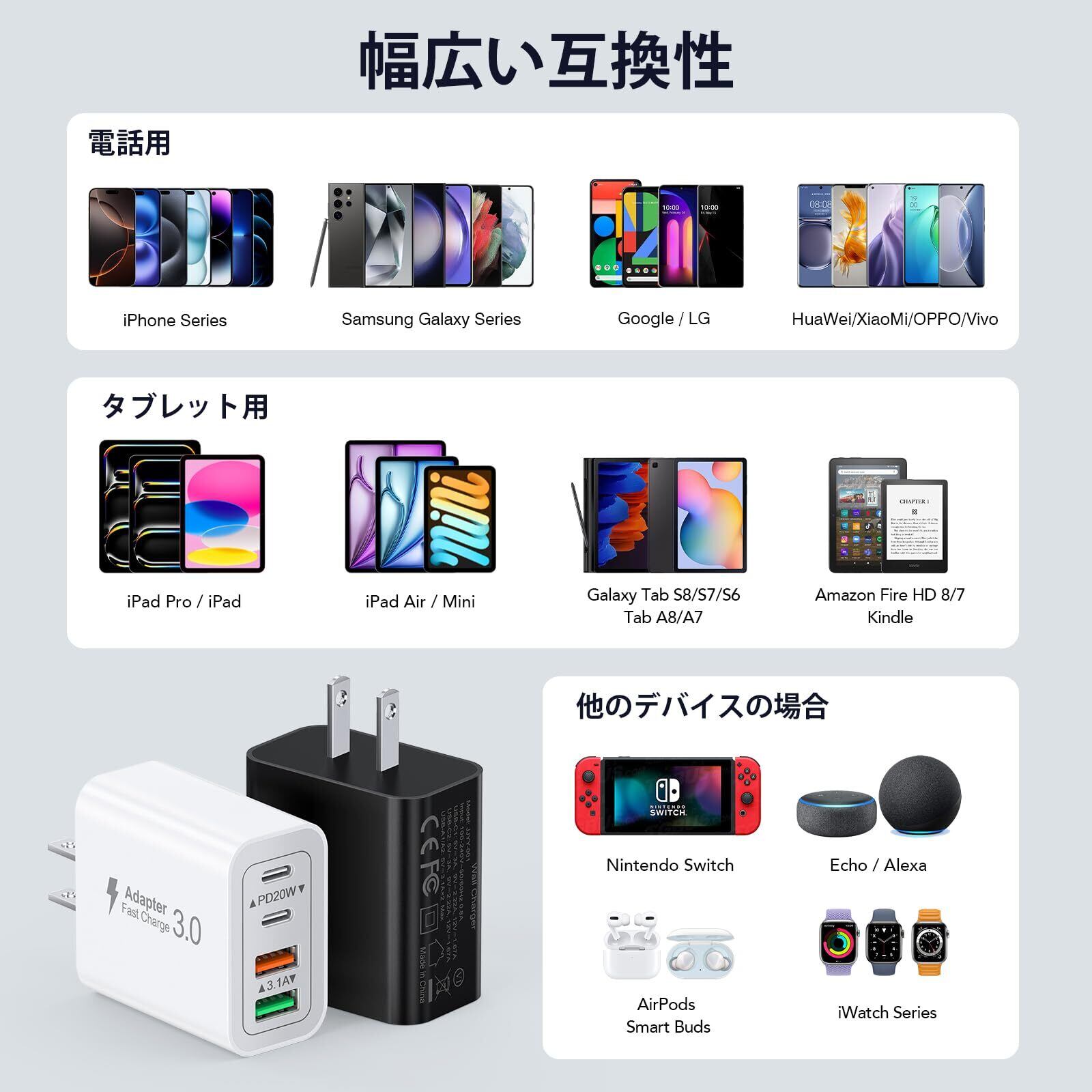 【ユニバーサル互換性PD充電器】: タイプc アダプタは特別な 4 ポートのため、ほぼすべての電子機器と互換性があります。iPhone 16/15/15 Pro /15 Pro Max/14/14 Pro/14 Pro Max/13/13 Mini/13 Pro Max/12/12 Pro Max/12 Pro Max/12 Mini/SE 2020/11/11 Pro/11 Pro Max/XR/XS/X/8/7、iPad Air/Pro/Mini、Samsung Galaxy、Haiwei、Xiaomi、タブレット、LG、Motorola、Google Pixel などのデジタル機器と互換性のある充電ステーションです。