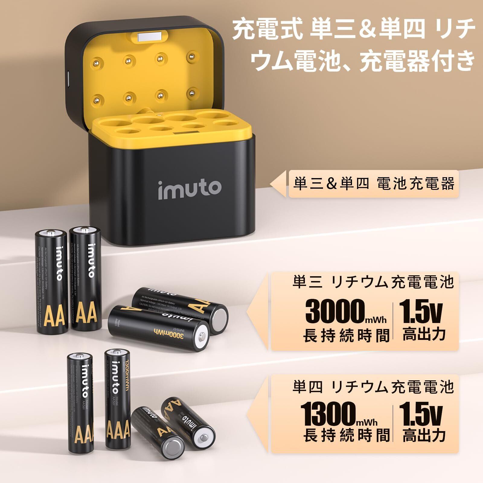 imuto 充電電池 単三充電池 単四充電池 リチウム充電池 1.5V 急速充電 単3電池(3000mWh*4)+単4電池(1300mWh*4) 1600回以上循環使用可能 超長持続時間 充電器の組み合わせ 電池収納 Type-Cケーブル付属 日本語取扱説明書付き
