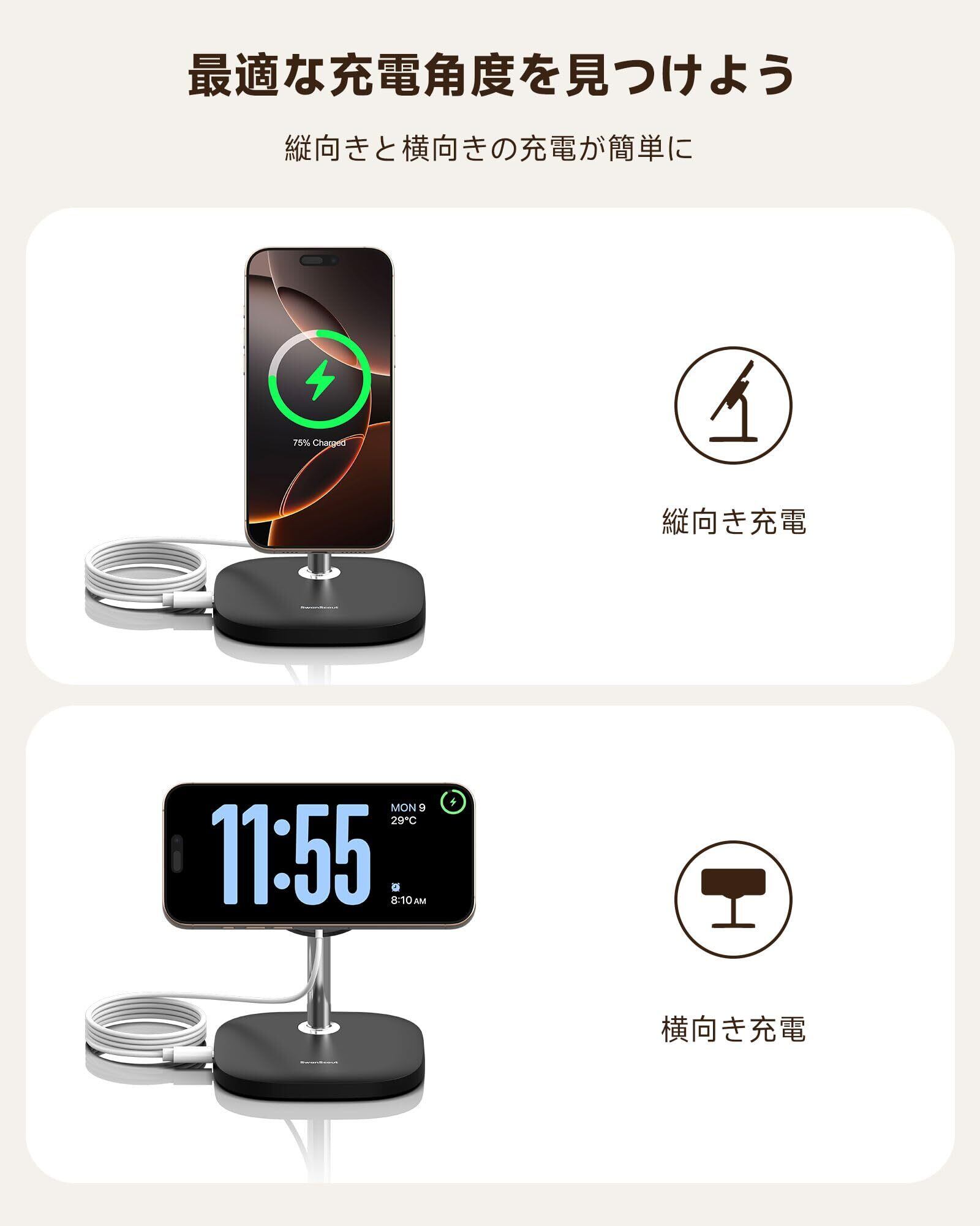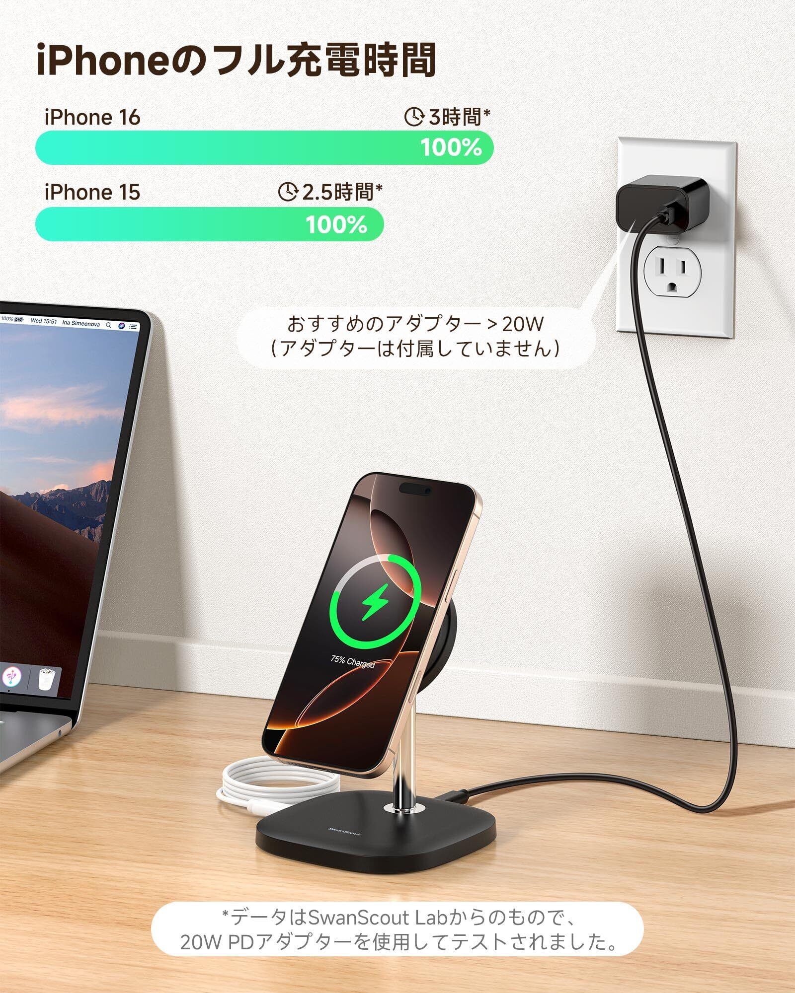 MagSafe対応 ワイヤレス充電器、iphone 充電スタンド、マグネット式 ステーション、マグセーフ 置くだけ 15W出力、iPhone 16/15/14/13/12シリーズ対応、SwanScout 506M