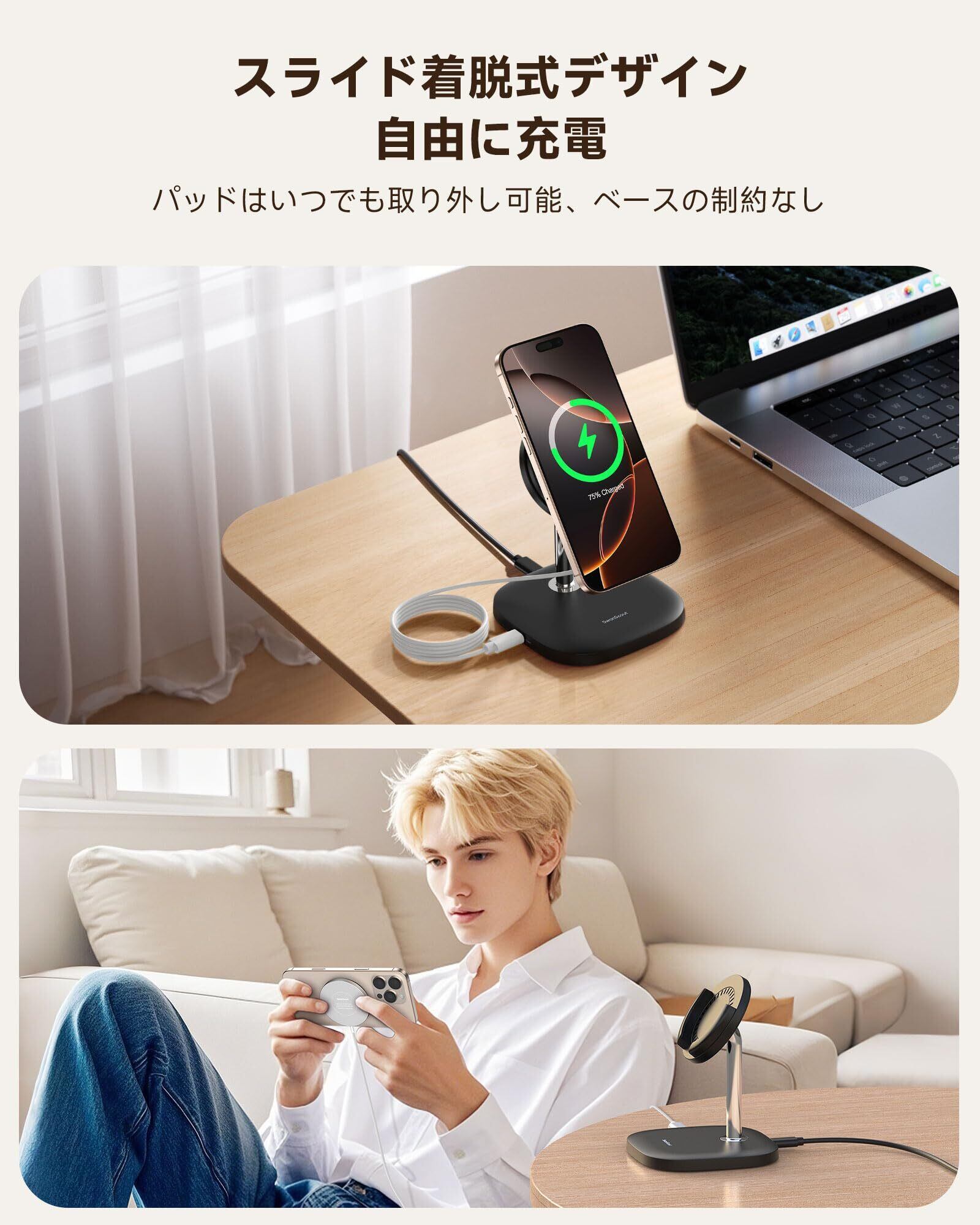 【スライド式で自由に充電】「充電しながら動かせない…」そんなストレスとはもうお別れ。スライドするだけで、マグネット式充電パッドを充電スタンドから簡単に取り外し、使いたい場所へサッと移動できます。土台の制限に縛られない、新しいワイヤレス充電体験をお楽しみください。