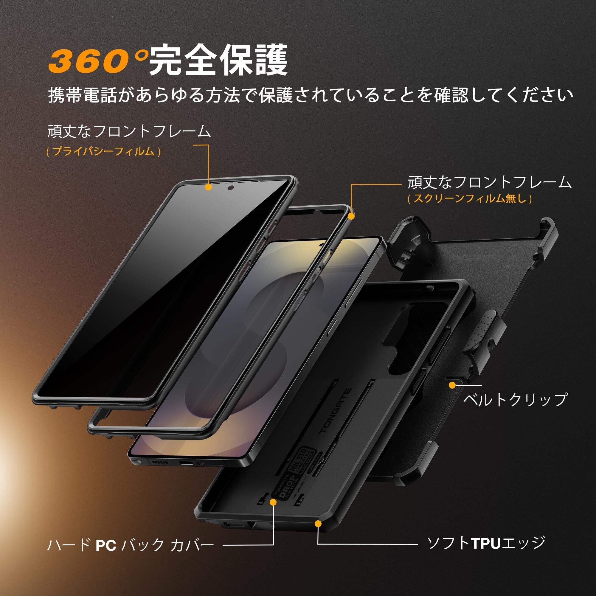 TONGATE for Samsung Galaxy S25 Ultraケース、[プライバシースクリーンプロテクター&スライドカメラカバー付き] [2フロントフレーム] フルボディヘビーデューティー耐衝撃 S25 Ultra用ケーススタンド&ベルトクリップホルスター付き、ブラック